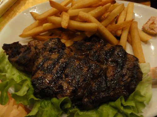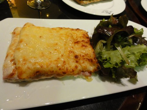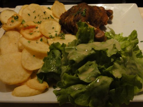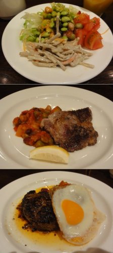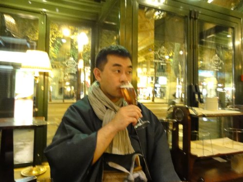 着物でシャンゼリゼを徘徊した後、夜の食を求めてちょっと裏通りへ。最初入ろうと思っていた店が休みだったので、ぶらぶらとお店を探す。値段と落ち着き具合を見て、良さそうな店に入る。レストラン部分は落ち着いた風情だったのだけど、バーコーナーにスクリーンがあって、そこでサッカーを放映していた。あ、しまったと一瞬思ったけど、皆、お酒を飲みながら静かにテレビを観ている。日本人みたく騒がないんだあと安心した。