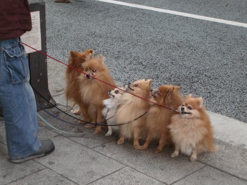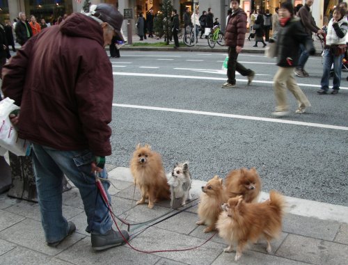 昨日、銀座の歩行者天国に行ったら、何やら人だかりが・・・。また、怪しい踊るペラペラ人形かと思いきや、大きなセントバーナード犬が、ごろんと寝っころ がっていた。周りをよく見ると、チワワやトイ・プードルなどいろんな種類の犬がたくさん。最近、銀座のホコテンを犬を連れて散歩する人が本当に増えたな あ。 さて、写真は、銀座ポメラニアンズ。と勝手に僕が呼んでいるのだが、彼ら?もよく銀座で見かけるのだ。いつもは、カメラを持っていなくて悔しい思いをしていたが、昨日は、ばっちり撮ったぞ。行儀が良くて可愛いのだ。飼い主は、可愛くないんだけど。 とにかく、よく言うことを聞くのよねえ。皆で綺麗に並んで飼い主を見ている。なんと忠実なこと・・・。 しかし、犬は、本当に可愛い。 よく見たら、一匹だけ、そっぽを向いている。 |