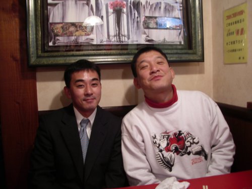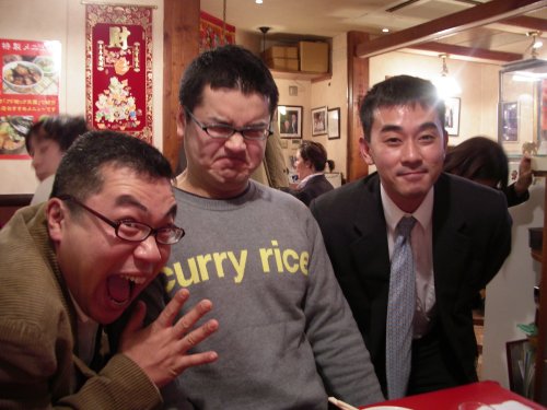 久蔵 「粗忽の釘」 <-3月に真打昇進 おめでとう 金時 「猫の災難」 で、終演後、久蔵さんが抽選会 の賞品に持ってきていた賞品を出し忘れていたということで、みつまさのご主人のはからいで、その賞品をいただいた。それは、あの有名な「木久蔵ラーメン」 だ。テレビの「笑点」では、不味いとバカにされているが、そんなはずはない。何故なら、東京駅名店街の東京土産売り上げNo.1は、実は、この「木久蔵 ラーメン」なのだ。週末に作ってみようっと。 久蔵さん、みつまさのご主人、ありがとうございました。 今年初めてのみつまさということで、ご主人と女将さんにも年始の挨拶。その後、金時師匠のお誘いに甘えて、打ち上げにご一緒させていただく。 で、錦糸町の中華料理屋さんへ。今日こそは、ちゃんとお金を払おうと思っていたのに、またしても、金時師匠にご馳走になってしまった。申し訳ない。次回は、僕が必ず。金時師匠「じゃあ、福臨門でね」。はっ、了解。 ところで、2ヶ月で11kgの減量に成功した金時師匠。なんか、可愛い少年のようになってたなあ。若々しい・・・。 あ、しまった。やっぱり写真は、こうじゃなくちゃ。一人、普通に映ってしまった自分に後悔。うーん、表情を勉強しなければ・・・。 ちなみに、左は、久蔵さん、真ん中は、金翔さん。 |
