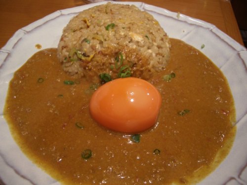 カレーとチャーハン、意外と合う。真ん中の玉子は、黄身でなく白身もある茹で卵。白い部分が色づけされている。