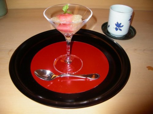 デザート。グレープ・フルーツにラズベリー・ソース。甘さと苦味が絶妙。