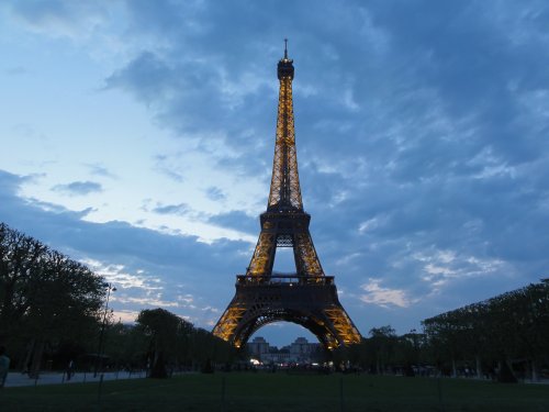 周りに何もないというのは、やはりそのもののシルエットが映えるな。贅沢な都市計画だと思う。東京タワーなんて、いったいどこから見たら綺麗なシルエットが見られるのか分からないもんね。できた当初は、どこからでも見えたんだろうけどねえ。 きらきらイルミネーションには時間が早く、何せ夜9時でも明るい。サマータイムのせいか。夜9時のイルミネーションは無かった。夜の10時まで近くのカフェで時間をつぶす。レモネードを頼んだ。ここのカフェ、軍服姿の人が多いなあと思っていたら、名前がOfficers' Cafeみたいなそんな店だった。すぐ近くに陸軍士官学校あるからなんだね。 夜10時に再びエッフェル塔へ。 では、きらきらエッフェルをどうぞ。 |