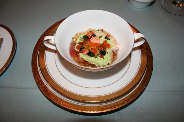 焼き茄子と赤貝、雲丹、イクラと温泉卵にコンソメゼリーとズッキーニのピューレ添え