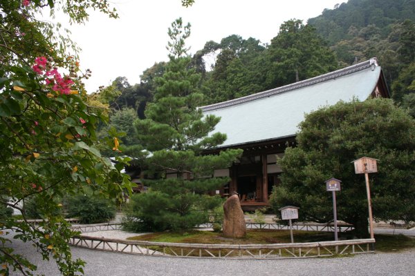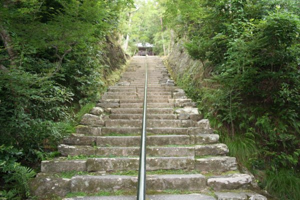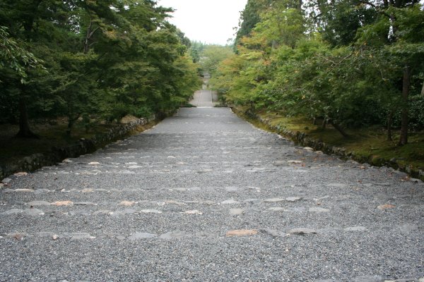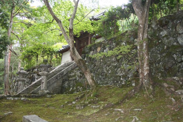 二尊院と言えば、階段です。山門を抜けて、そこから続く本道への階段が、なんとも贅沢な空間で、また古代へタイムスリップしたような不思議な風情を味わうことができます。秋の紅葉の時には、人で埋まるこの境内も、今は、一人でゆっくりとこの階段を登ることができます。 登りきったところから山門の方が見下ろしてみました。この風情、たまりません。 本堂です。中には、寺の名前の通り、小さいですが、二体のご本尊が安置されています。 本堂後ろから続く階段です。二尊院は、やはり階段が素晴らしいです。 応仁の乱で全焼した寺ですが、その後、後奈良天皇、後柏原天皇により復興されました。境内には、天皇の御陵もいくつかありました。 |