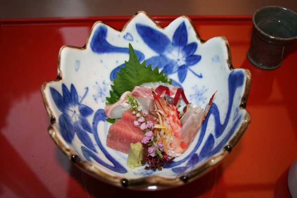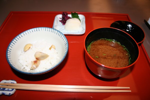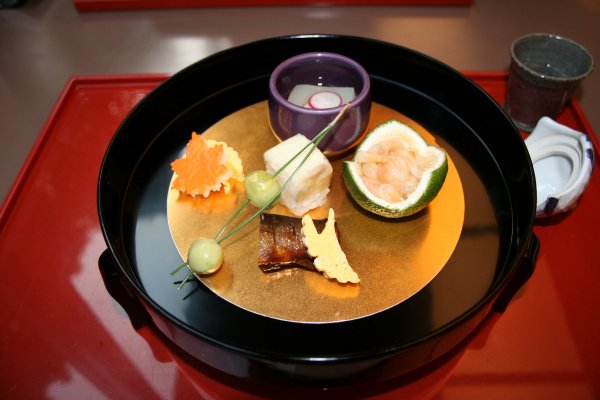 前菜、烏賊このわた和え、銀杏、紅葉真丈、焼茄子豆腐、鮎甘露煮、押し寿司、公孫樹玉子。