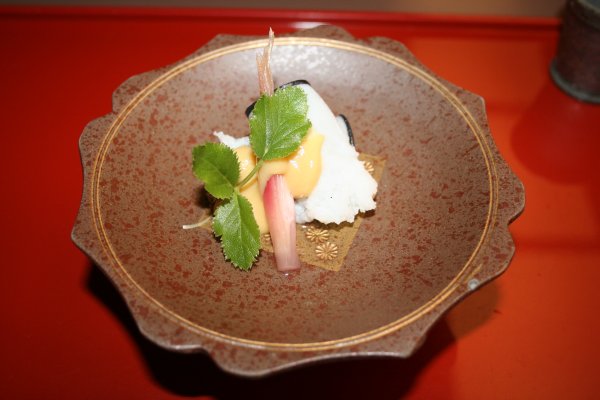 酢物は、尾羽毛水晶巻。防風、茗荷、酢味噌。