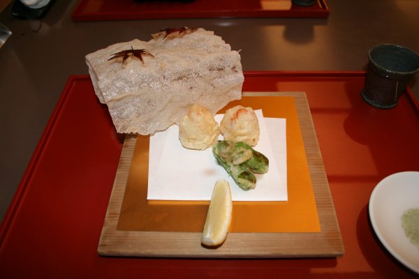 揚物は、雲丹のつみれ白扇揚げです。他にヤングコーンにライスペーパー、青唐辛子。