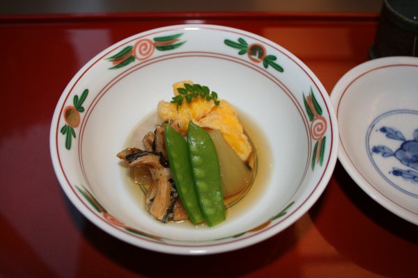 炊合せは、穴子大原木。焼き茄子、京芋、青身、伊勢海老オランダ煮。