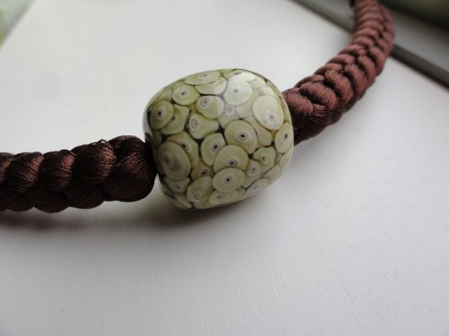 蜻蛉玉で羽織紐作ったら素敵だろうなあと思っていたら、あったよ。好きな蜻蛉玉を選んで羽織紐にできるみたいだったけど、それなりに時間がかかるので待ちきれず、すでに羽織紐になっているのを買っちゃった。 これがその蜻蛉玉。不思議なデザインでしょ?吸い込まれそう。 こういう硝子なキラキラ風なものと、つや消ししたものも素敵だったんだよねえ。 この蜻蛉玉、香川県の工房にのみやあ~とで作られたもの。結構、あちこちのデパートのイベントに出店しているみたい。また、素敵な羽織紐があったら買いたいな。 |