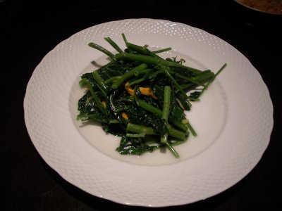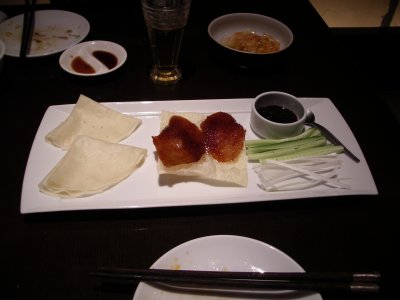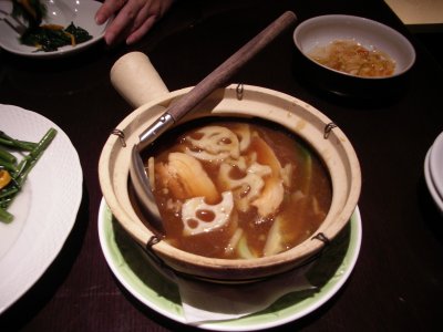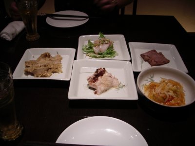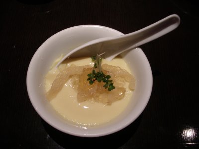 6000円のコースが特別に4000円だとういうので、そちらにしてみた。これは、前菜。刺身、ハツ、牛肉、鶏肉、白菜サラダ。 上海小籠包。黒酢でいただく。熱い肉汁が旨い。 にらまんじゅう。海老も入っていてプリプリ。 フカヒレの煮こごり。 一切れづつだったが北京ダック。うーん、不味くはないが、これじゃ満足できないっす。 あー、やっぱり北京で食べた北京ダックが忘れられない。 豆と青唐辛子と黄ニラと海老の炒め物。 空芯菜の炒め 皮付き豚バラ肉の甘醤油煮 うなぎとアサリのあえご飯、蓮の葉つつみ蒸し やわらか杏仁豆腐 一番美味しかったのは、これかも。濃厚な味わいにノックアウトした。これだけのために、また来たい。 |