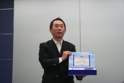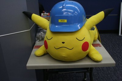 まずは整備場の講堂へ。いろんな飛行機関連のものが置いてあり、始まるまで勝手に写真撮影。 寝ているピカチュー。 入館証。 こうしたシールをはじめ、いろんなANAグッズが配られた。 成績優秀者に与えられる名前付きのプレート。他にギフトボックスがプレゼントされた。ANAマイレージ検定、受験者は4万人だったそうで、上位100人が成績優秀者として今日招待されたのだ。 表彰式の後、飛行機の歴史やしくみを楽しいクイズ形式で整備士の方が説明してくれた。話なれているのか、とても面白い。クイズに正解すると、またまたいろんなグッズがもらえる。 僕の席の前には、どこかで見たことある人が座っていた。(笑) この後、整備場へ。期待を胸にワクワク・・・・。 |