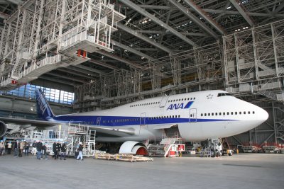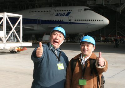 同じグループに東京パノラママンボボーイズのパラダイス山元さんがいらっしゃった。 パラダイス山元さんと言えば、まずはマンボなんだけど、われらANA修行僧の憧れのカリスマでもあるのだよ。この方ほど楽しんで飛行機乗っている人はいないよなあ。飛行機だけじゃなく、日本のサンタさんでもあり、入浴剤ソムリエでもあり、餃子の王様でもあり、マン盆栽家元でもあるすごい人だ。 とても気さくにお話してくれた。素敵な人だあ。 写真載せてもいいですかと聞いたら、「どうぞ、どうぞ」と言っていただけたので、載せちゃった。 パラダイス山元の世界マンボ紀行 http:// これは、ネットで読めるマイル修行僧のバイブルだね。 でも、もう最終回なんだって・・・。こんな面白いものが終わってしまうだなんて残念だー。どかで再開されないかなあ。 パラダイス山元さんもたくさん写真や動画を撮られていたよ。(笑) 近くで見る機体は、美しくそしてやっぱり大きい。ジャンボが格納庫にいてくれて良かった。 大きくてとてもフレームに入りきらない。 エンジン。GE社製だった。 タイヤ。横にスリップすることがないので、縦溝のみ。着地面を広く取るために溝は少なくしている。万が一燃えることを防ぐため、中は空気ではなく窒素ガスなのだとか。 ジャンボは、座席の取替えで格納庫入りしていた。取り外された座席が並んでいた。 これは、タイヤのブレーキ。 格納庫の床には、飛行機の中心を載せる赤ライン、飛行機の鼻先の停止位置を表すNOSEの印が機種毎にあった。 整備士の道具箱。映画「ハッピー・フライト」でも紹介されていたが、名前入りで、道具が一つでも見つからないとこの整備場からは出られない。 格納庫から見た空港滑走路。見学する日によっては、格納庫の扉が閉まっていることもあるらしい。今日は、ラッキーですねと言われた。 楽しくて、ずっといたい気分だった。 |