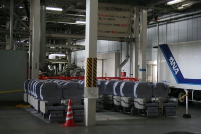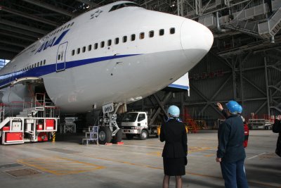 整備士の方の楽しい飛行機講座の後は、楽しみにしていた整備場の見学。3つのグループに分かれて出発した。