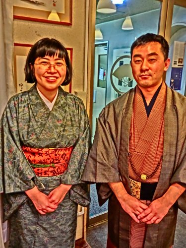 今回の趣向は、互いのネタ交換。馬吉さんの酔っ払いは、三之助師匠に比べるとそれほどグデングデンではなかったね。同じ噺でも演者によって違うものになるのが落語の魅力だよねえ。 ネタ卸しとは思えない、テンポも良く楽しい爆笑落語だった。 三之助 「唐茄子屋政談」 こちらも場内大爆笑。こっちもネタ卸しとは思えぬほどの楽しさに溢れひきこまれたねえ。 この噺は、ペーソスが溢れたいい作品だよね。特に吉原田んぼの場面は、賑やかさと寂しさが交互にフラッシュバックして秀逸。最高に楽しい時間だった。 三之助 「のめる」 仲入りを挟んでこれまた場内大爆笑の「のめる」へ。落語って楽しい、人間って馬鹿だけど愛しい、そんな風に思わせてくる高座だったよ。 恩田えり社中 オンステージ 社中って書いてあったから、また怪しい飛び入りがあるのかなあと思ったら、僕だったよ。最前列で着物姿だったから指名されて、傘でマリを回す曲芸をやらされた。もちろんお囃子は、えり師匠。いい記念になったよ。(笑) えり師匠らしい、茹で玉子のエピソードも大笑い。 馬吉 「真景累ヶ淵-豊志賀の死」 まさかのもう一つネタ卸し。まさかの真冬の怪談。やるねえ、馬吉!夏には、どんな風に出来上がっているのか、また観たいよー。 正直、寿司屋の二階の場面は、もうっちょと不気味で怖いといいねえ。 美青年の新吉は、馬吉さんとだぶっていいんじゃない? これは、今後に期待だね。 終演後、HDRアートモードで三之助師匠もおさえておいたよ。 えり師匠からは、「生き恥」をさらしたお礼にと、記念品いただいた。 そしてまた着物ツーショット。ビバ和服! |