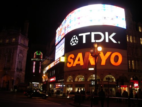 劇場街のウエストエンドの最寄駅の一つピカデリー・サーカス。ここは、リージェント・ストリートとも交差しており、夜でもとびきり賑やかなところだ。コカコーラのネオンの下には、日本のTDKと三洋電機がキラキラ輝く。