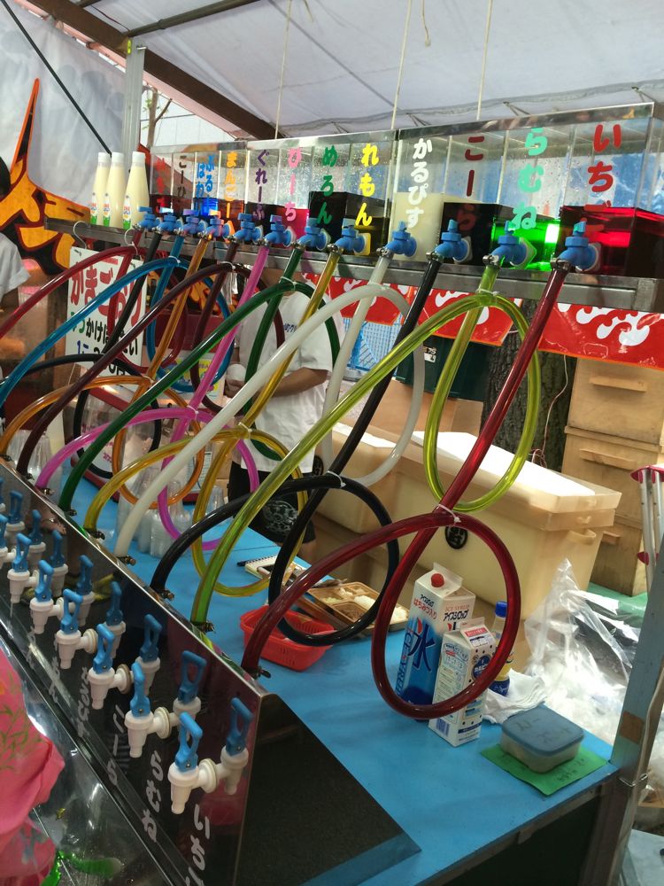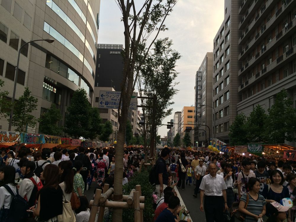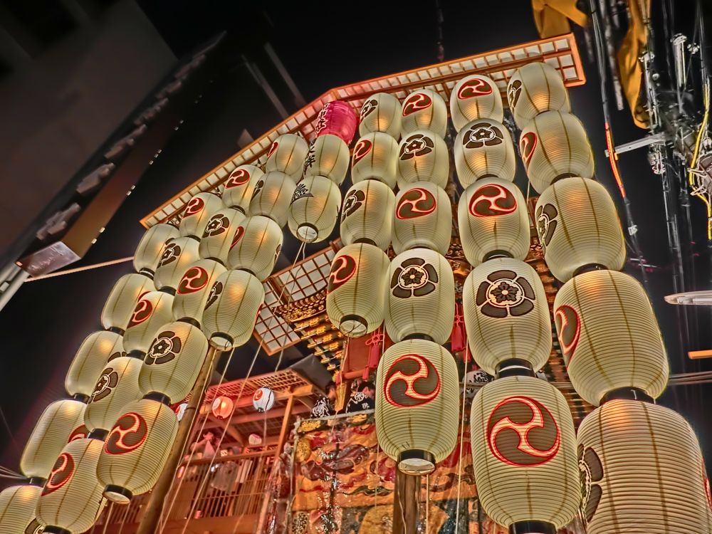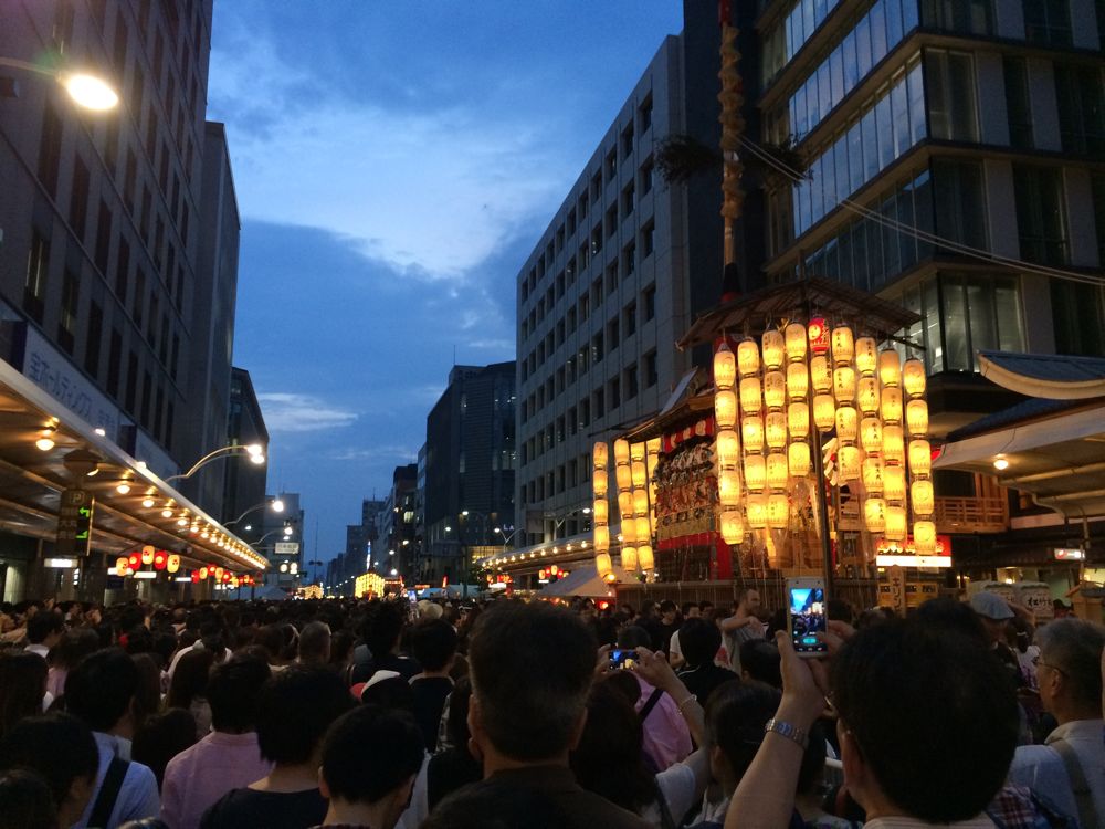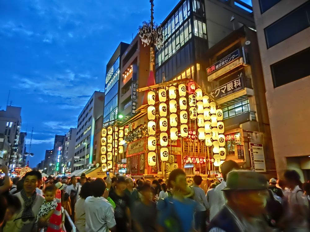 四条烏丸から烏丸御池までの通りの歩行者天国は、道の両脇に露店が並んで大賑わい。お店で売っているグッズは、最近のものが反映されており、ふなっしーとか妖怪ウォッチとかもあった。 暑いからかき氷も飛ぶように売れていた。お好きなシロップをかけて召し上がれ。 四条通りも歩行者天国。でも一方通行逆走禁止。明日、巡行する山鉾が提灯を灯して並んでいる様は、とっても幻想的。コンチキチンと祇園囃子が鳴り響き、前夜祭のムードは最高潮に。 各町に置かれた鉾には、ちまきを買うと登って中に入ることができる。隣接するビルから鉾の二階への渡り廊下が設置されている。明日、巡行する山車の鉾に乗ることができる、これが祇園祭の魅力のひとつ。市民に開かれた祭だなあと実感。 大通りにある山鉾もすごいけど、細い路地にでーんと佇む姿もこれまた迫力。 こちらは山の展示。巡行する山鉾以外にも、各家々が代々伝わるその家の名品、名宝を外を歩く人からも見えるように窓を開けて陳列しており、町中が芸術ギャラリーになったよう。大混雑の通りを少し離れて、そうした家々が並ぶ小道を歩くのも祇園祭の醍醐味だ。 しかし、あちこち一方通行になるので、宿泊しているホテルに戻るのが大変。 |