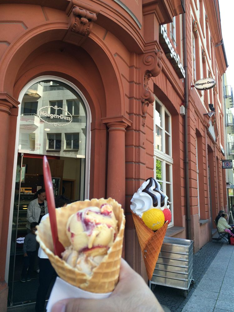 朝食を食べようと思っていたお店が昼からしかやってなく、しばしフランクフルトの街をぶらぶら。やっているお店が少ないなか、持ち帰り用の総菜が店先に並んでいるところがあり、入ってみると奥に食べられる席があったの入ってみる。手前には野外の席もあるけど、喫煙可なので避ける。 フランクフルトは、英語が通じるなあ。僕の片言ドイツ語の出番無し。ミュンヘンより、ずっと英語が通じる。さすが、国際金融都市。 ドイツっぽいものを頼んでみた。見た目とか、盛りつけとか、そういうのこの国では気にしないよね。肉とジャガイモ、これはこれで美味しいよ。一週間これだときっと飽きるだろうけど。 ドイツと言えばビールだけど、ここフランクフルトの名物は、アップル・ワインなんだよねえ。 Metzgerei Heininger http://www.metzgerei-heininger.de Richard Heininger Neue Kräme 31 60311 Frankfurt お店の前は、広場。その向かいにハーゲンダッツがあった。日本から店舗がなくなってしまったハーゲンダッツ、今は、海外旅行での楽しみの一つ。大好きなドルチェ・デ・レチェが食べられるんだよね。 |