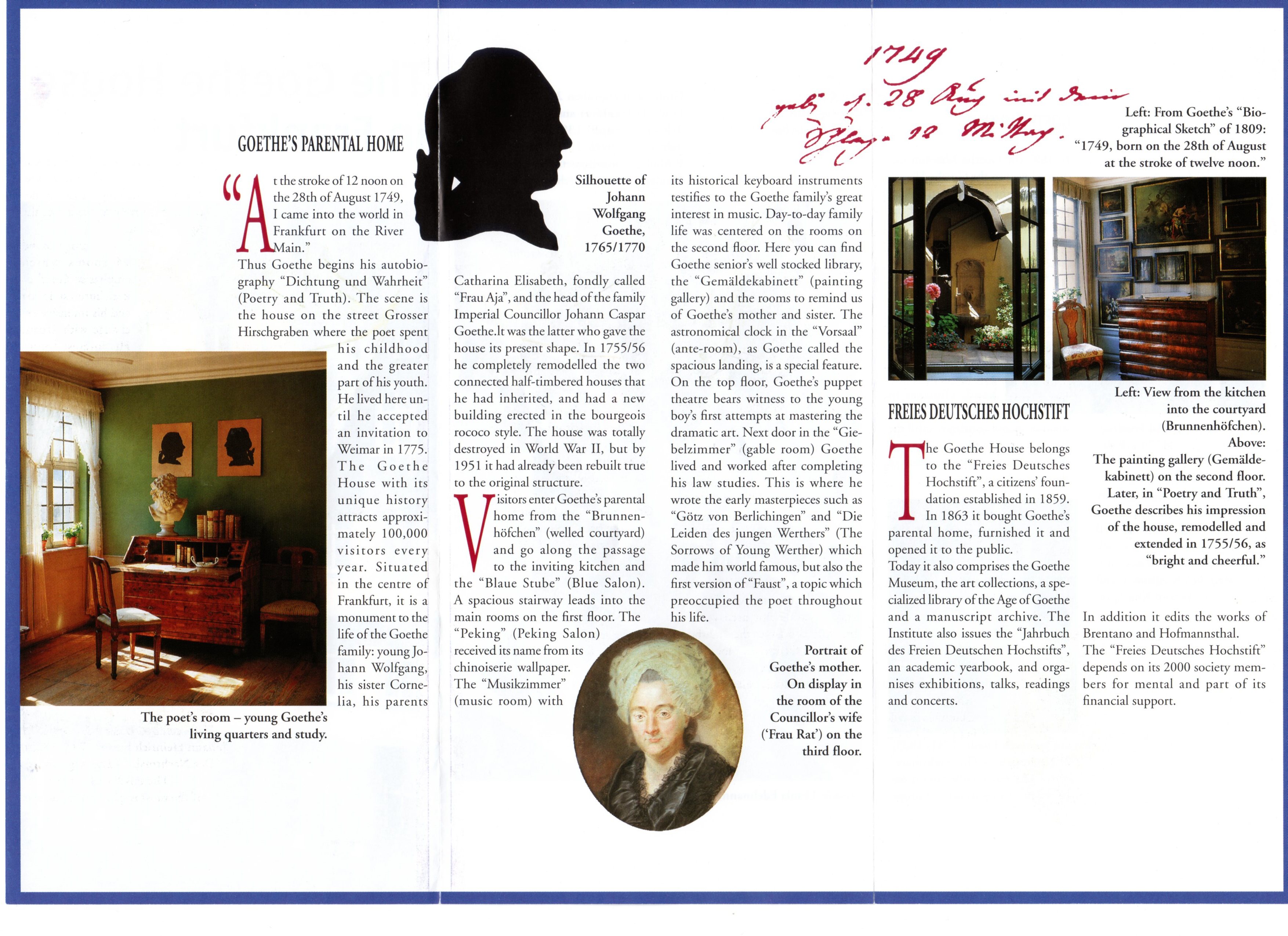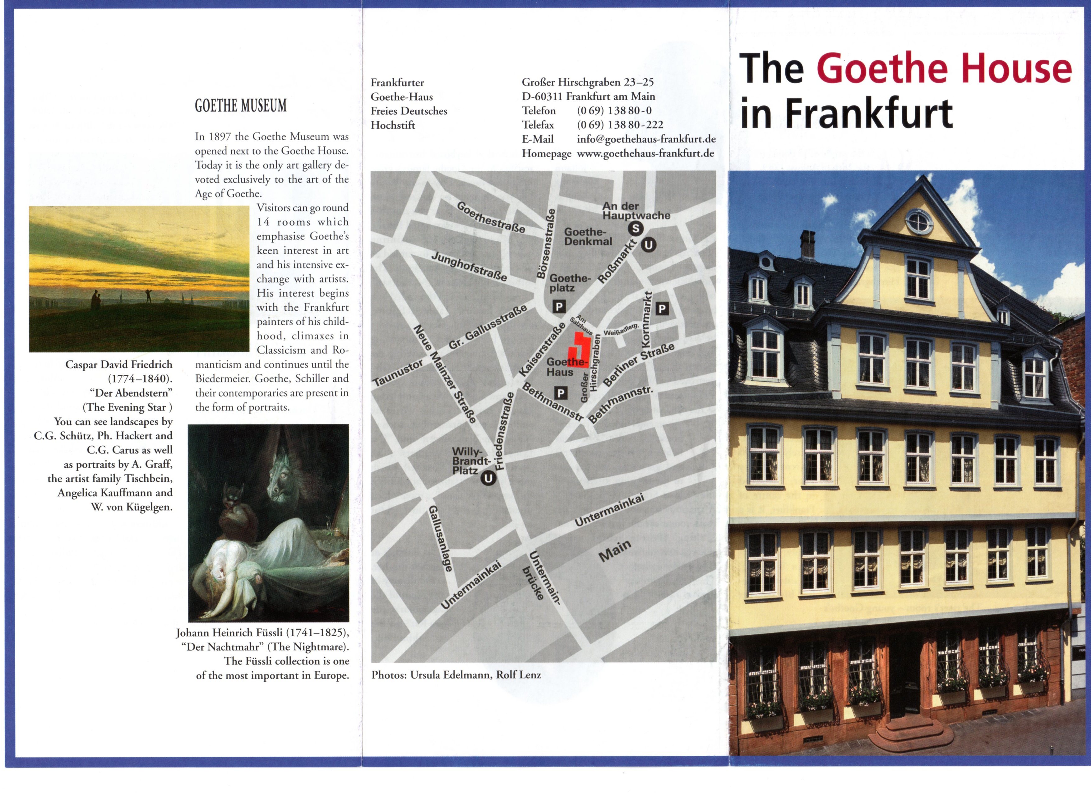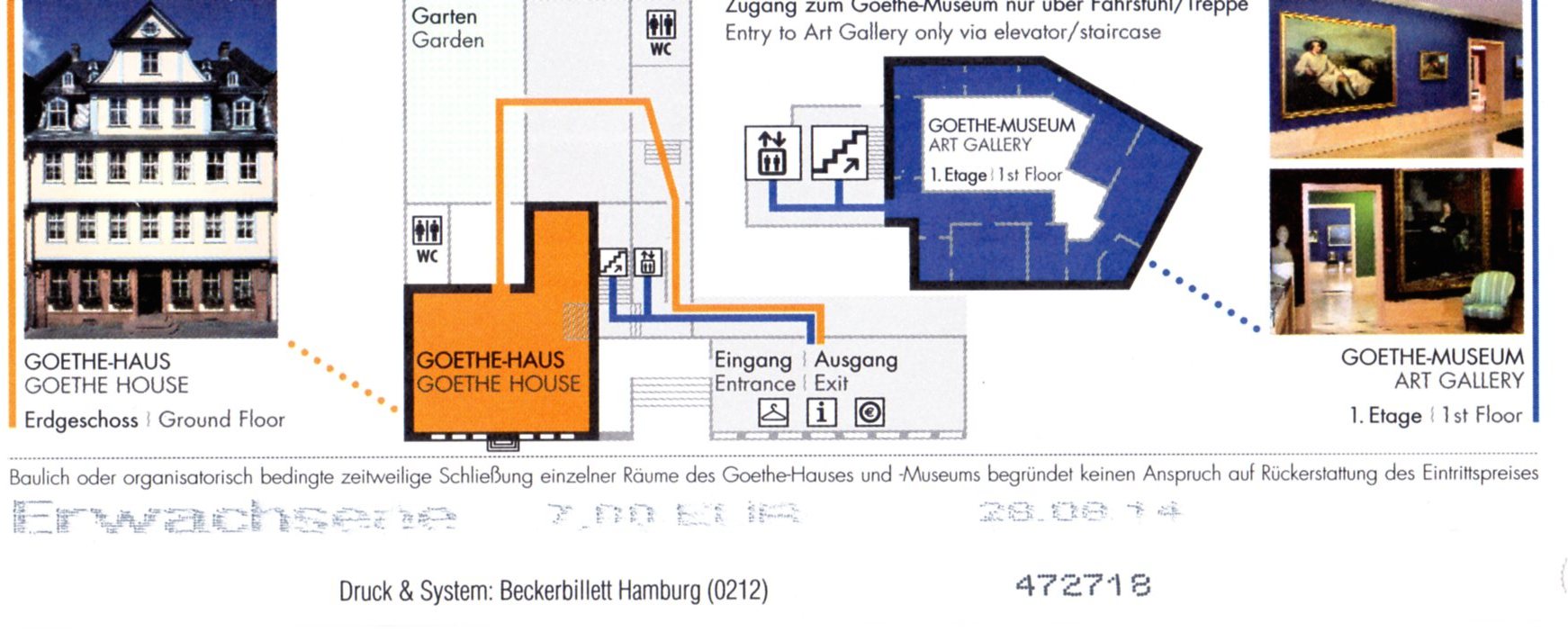 フランクフルトは、文豪ゲーテが生まれた街。その生家が公開されている。と言っても家は、第二次世界大戦で破壊されてしまったため忠実に再建されたものだ。ただ調度品は、疎開していたのでその当時のものらしい。直筆の原稿とか残っているのかと思ったけど、そうした展示は無かったねえ。1階にいたおじさんが気のいい人で、日本語で挨拶してきた。 4階建て、置き時計なども美術品のように素晴らしく、裕福な家に生まれ育ったんだね。 ゲーテハウスのチケット 入場料は、7ユーロ オレンジ色の部分の生家と隣接している青色部分の博物館が観覧できる。博物館には、ゲートと親交があったまたは同時代の画家の作品が展示されている。 ゲーテ関連の資料の展示が少ない(最上階に少しある程度)のでちょっと拍子抜け。借りなかったけど、音声ガイドを聞けば、そうした説明があったのかな? |