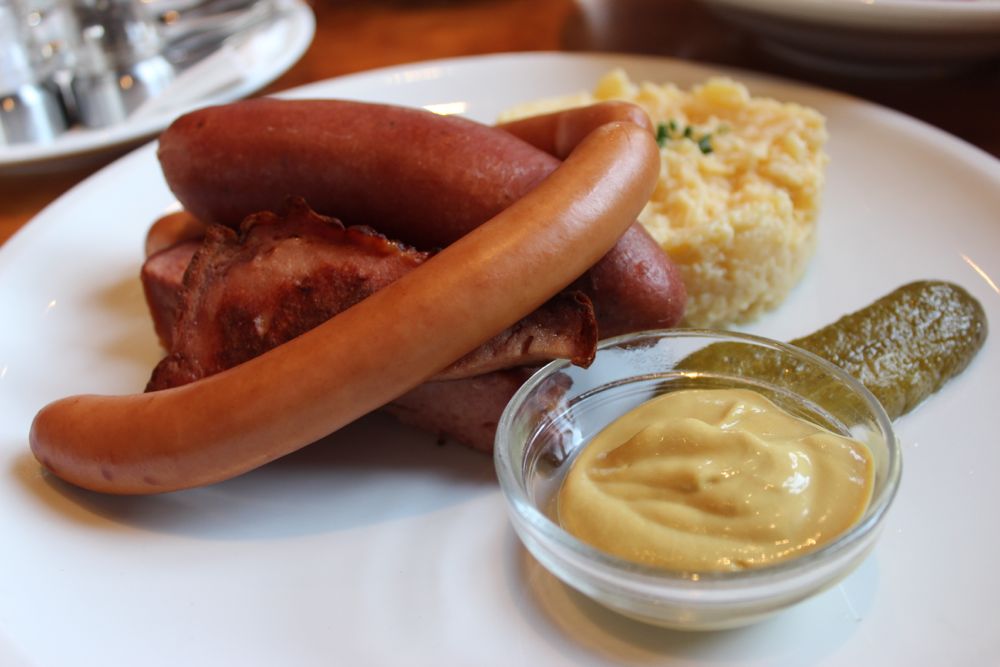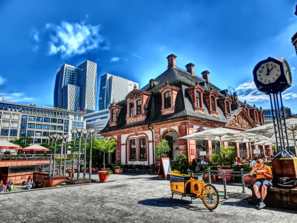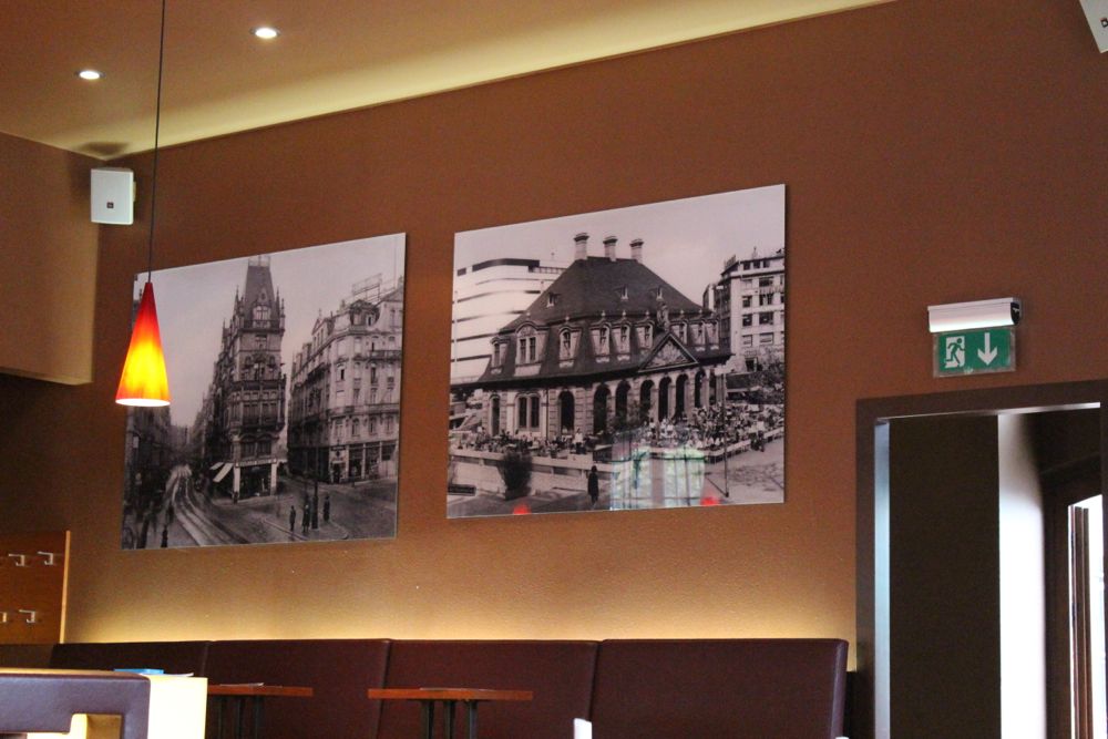 | 1904年創業のカフェ。大繁華街の入り口Hauptwache駅の真上にある。後ろにそびえるユニークな形のビルにジュメイラ・ホテルが入っている。 カフェの屋外席の方が雰囲気はいいんだけど、喫煙可なので店内に入る。 店内は禁煙。でもほとんどのお客さんが屋外席にいるので、なかなか店員さんが回ってこない。 この店の名物と書いてあったフランクフルター・セット。あ、これこれ、やっぱりフランクフルトと言ったらこれくらい太くなくちゃね。ソーセージとハム、ああ、ドイツだわ。 シーザー・サラダ。マスタードベースのソースがちょっと嫌。もっとチーズチーズしてほしい。マスタードがチーズの味を消しちゃう。 そしてまたしてもアップル・ワイン。 やはり第二次大戦で焼失したので、戦後復元建て直されたみたい。 Café Hauptwache 中心街にあるのでひっきりなしにお客さんでいっぱい。 http://web.cafe-hauptwache.de/ | |