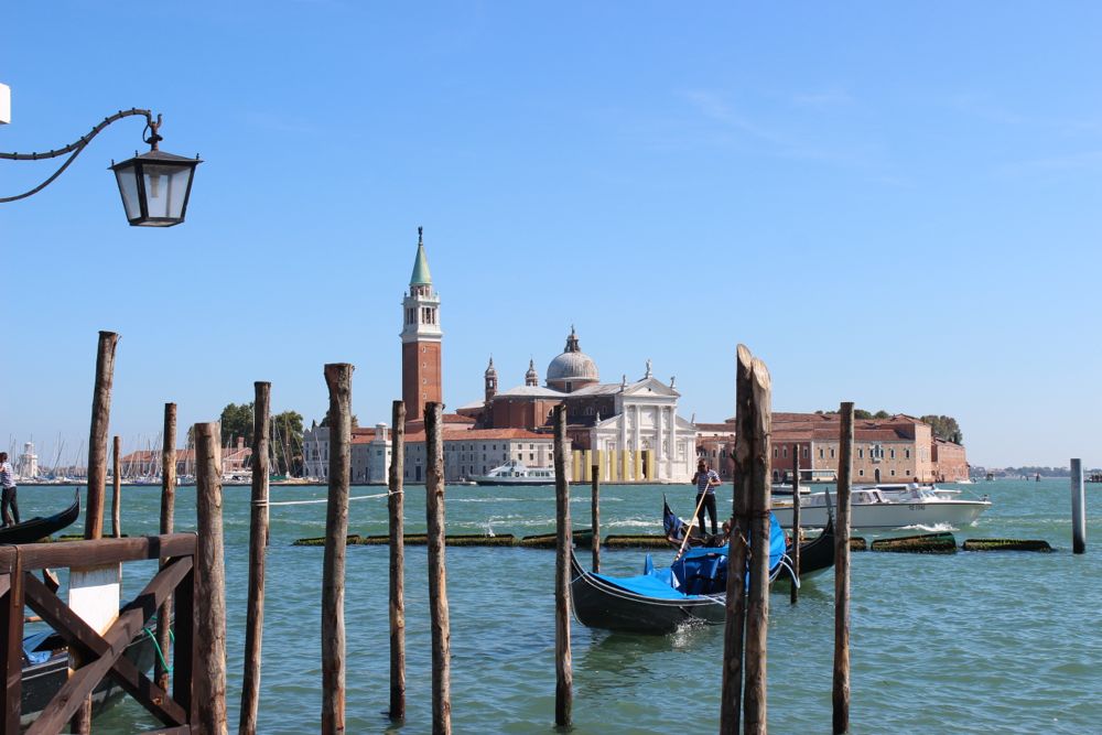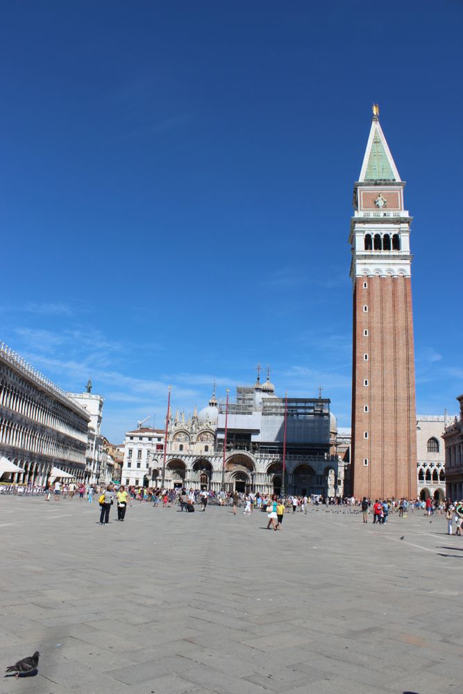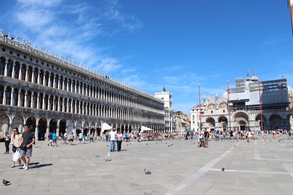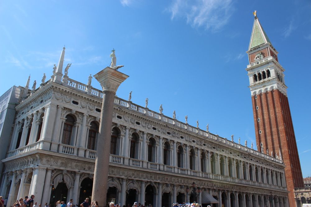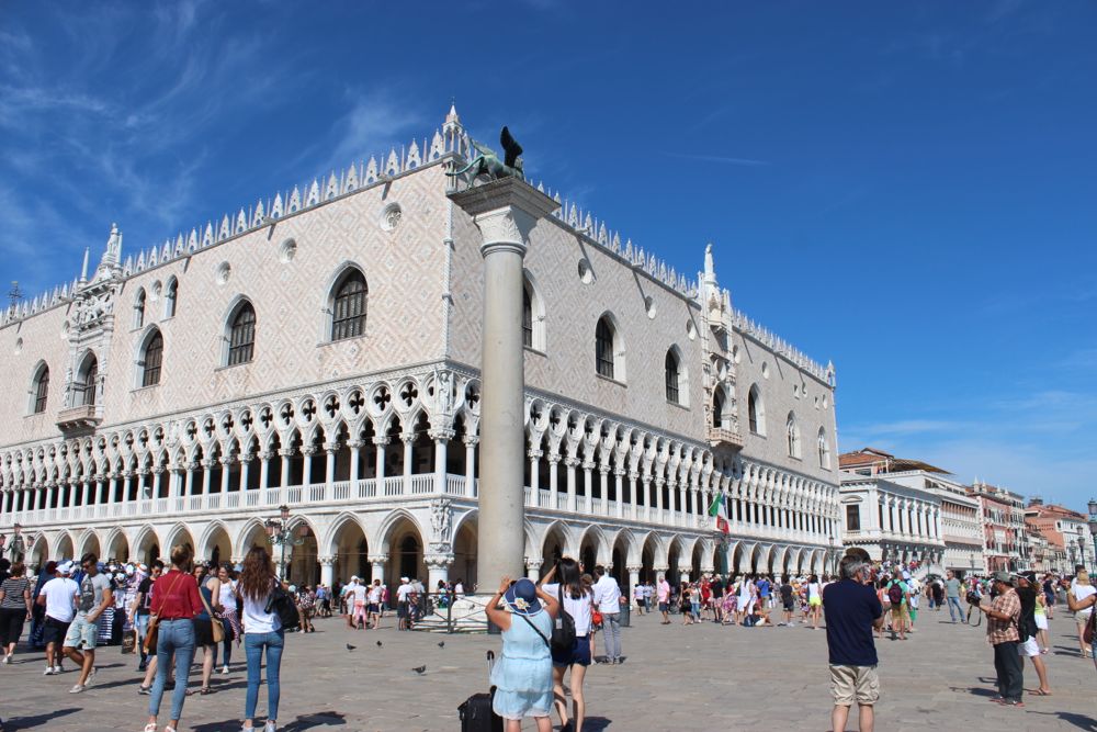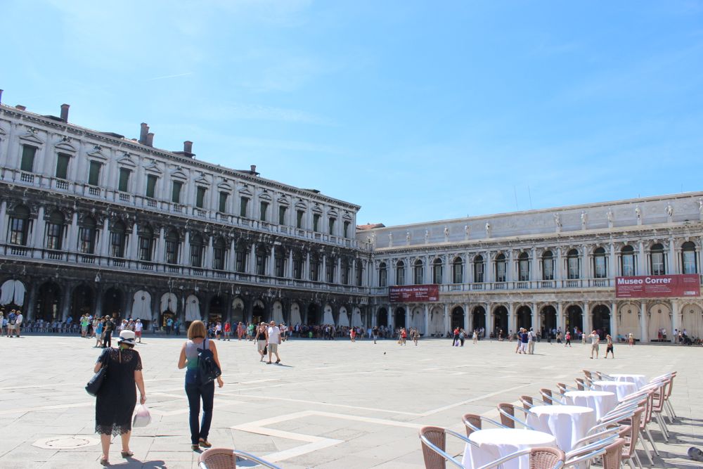 世界に有名な広場は数あれど、美しさでその筆頭とも言ってもいいだろう。L字型の広場で海にも面している。青空を突きさす塔、音楽を奏でるカフェのある回廊、サン・マルコ寺院、ドゥカーレ宮殿が完全なる調和を持って存在している。景観を乱す現代建築が一切ないのがヴェネツィアのすごいところ。 残念ながらサン・マルコ寺院の上部が修復中だった。 海に面する広場から見える景色。対岸の島にあるサン・マジョーレ教会。建築のトリエンナーレが開催中で、杉本博司デザインの茶室が展示されているとことで行きたかったのだけど、今回はいろいろあって行けず。 ドゥカーレ宮殿。ヴェネツィア観光のハイライトだけあって、ものすご人でごった返していた。 サン・マルコ広場から続く3月22日通りには、ルイ・ヴィトン、プラダ、フェラガモ、エトロ、グッチ、エルメス、ディオールと高級ブランド店が並ぶ。どこに行ってもルイ・ヴィトンはさすがの規模だが、イタリアだけあり、プラダ、フェラガモ、グッチも大きい。路上ではどうどうと偽物も売っている。 |