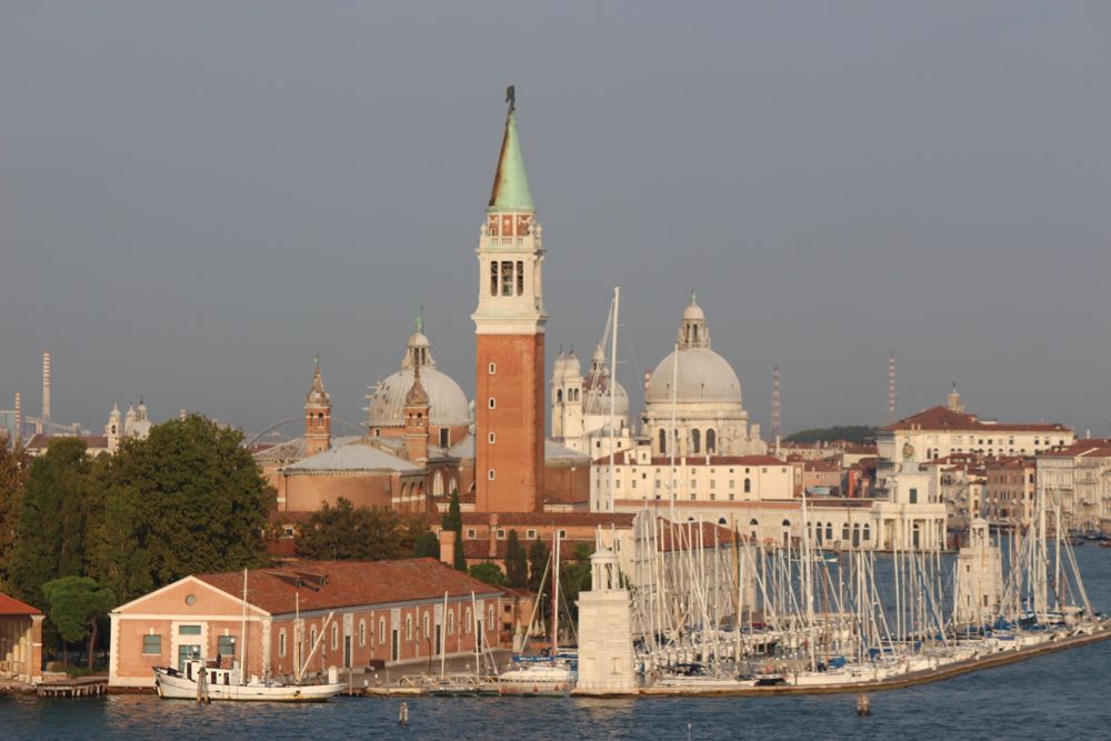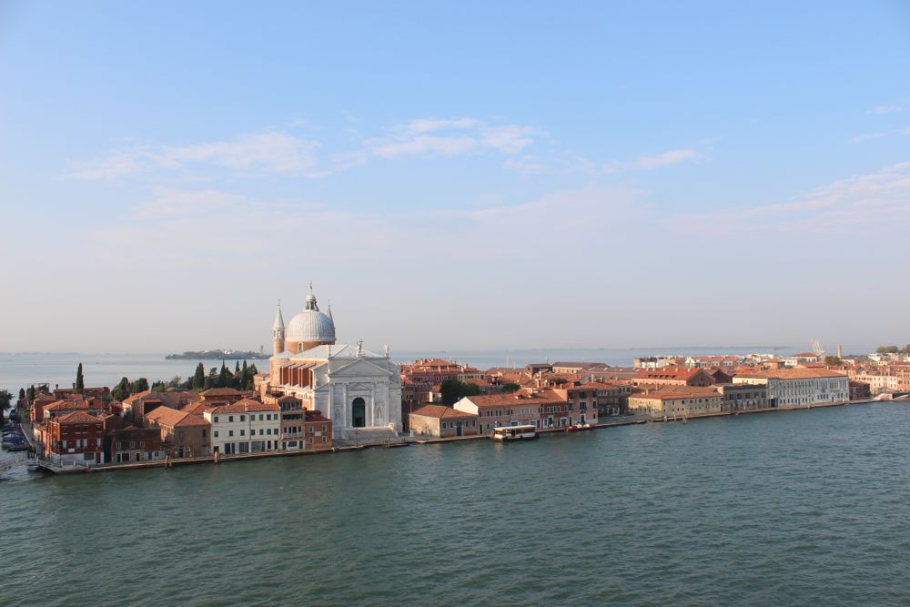 一週間前に見た塔が見えてきた。なんという眺めだろう。本当に現代の街とは思えない。 サンマルコ広場の塔とドゥカーレ宮殿が見える。 数々の映画で有名なホテル・ダニエリ。 サン・ジョルジョ・マッジョーレ島は、そのほとんどがサン・ジョルジョ・マッジョーレ教会だ。 教会の前の黄色い柱は、アートイベントのトリエンナーレのオブジェだ。実は、今年はトリエンナーレの建築展の年で、ここに杉本博司のガラスの茶室が展示されていたので見たかったのだが、いろいろあって行けなかった。これが心残りかな。 元工場であった建物を改装してホテルにした、ヒルトン・モリノスタッキー。今回、ここでの宿泊も考えたけど、どこに行くにも船に乗らないとならないため、パスした。 港に着いたけど、数千人の乗客を一度に降ろすことができず、船内で待機。下層階の乗客から順に降ろしているのだ。僕の階は、一番最後。しかし、船室からは早々に出されてしまうので、皆、カフェテリアやラウンジの椅子やソファでなすすべもなくぼうっとしている。3時間ほど待って、やっと下船。疲れたねえ。 |