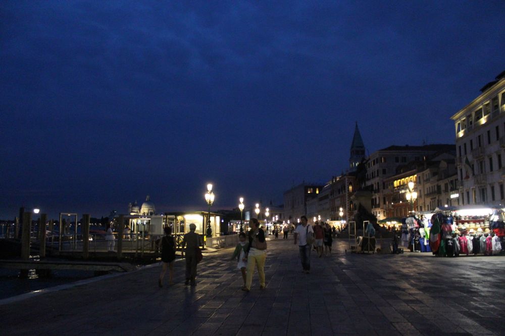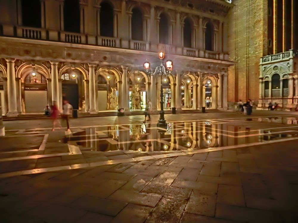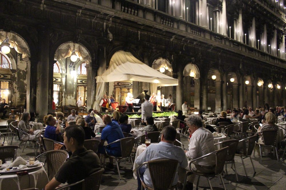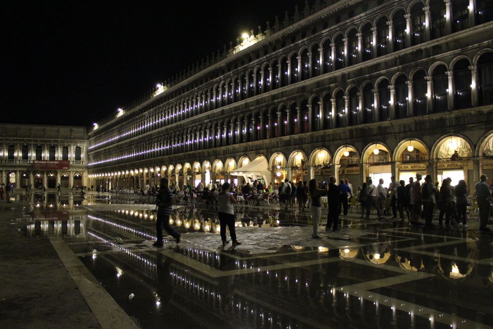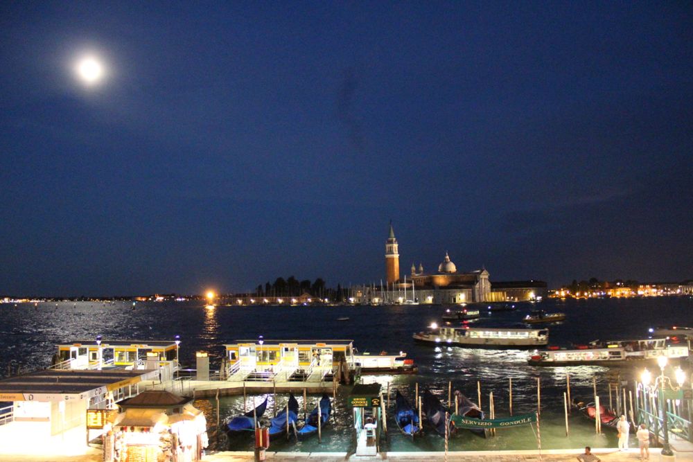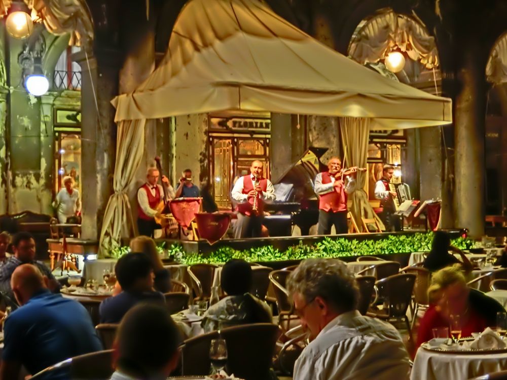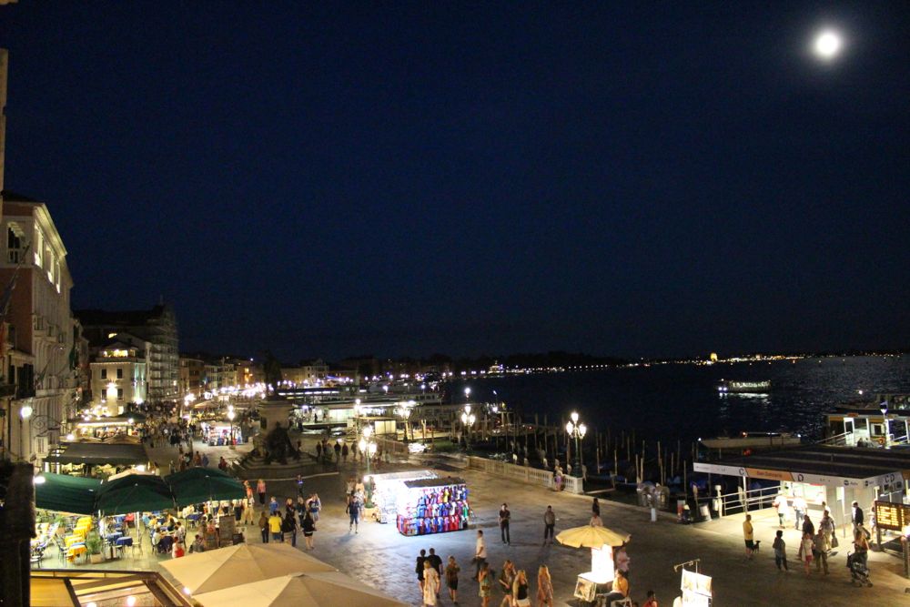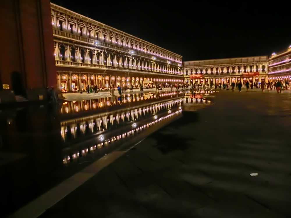 夕暮れ時から、ヴェネツィアの街を散策。まだまだすごい観光客の数。 海に浮かぶヴェネツィアだけにシーフードのお店が多い。 屋外席の店が多い。何故かピザ屋がたくさん並んでいた。 夜のサンマルコ広場。 マンホールのようなところが水があふれて水たまりになっていた。雨が降ったわけではない。夜は、この水たまりに広場の建物と照明が映り込んで綺麗だ。 1720年創業のヴェネツィア最古のカフェ、フローリアン。カフェ・ラテ発祥の店らしい。屋外席では、生演奏があり、大盛り上がり。 同じ生演奏のカフェが反対側にもう一軒あり、互いに競いあっていた。 広場の回廊は、アーケードになっていて観光客目当てのたくさんのお店がある。 夜遅くまで観光客がいるので、開いている店もいくつかある。 ハードロック・カフェもちょっと洒落ている。店前の運河には、ゴンドラがたくさん係留されている。 ホテルに戻って、部屋の窓を開けるとこの景色。ロマンチック過ぎるぜ。 |