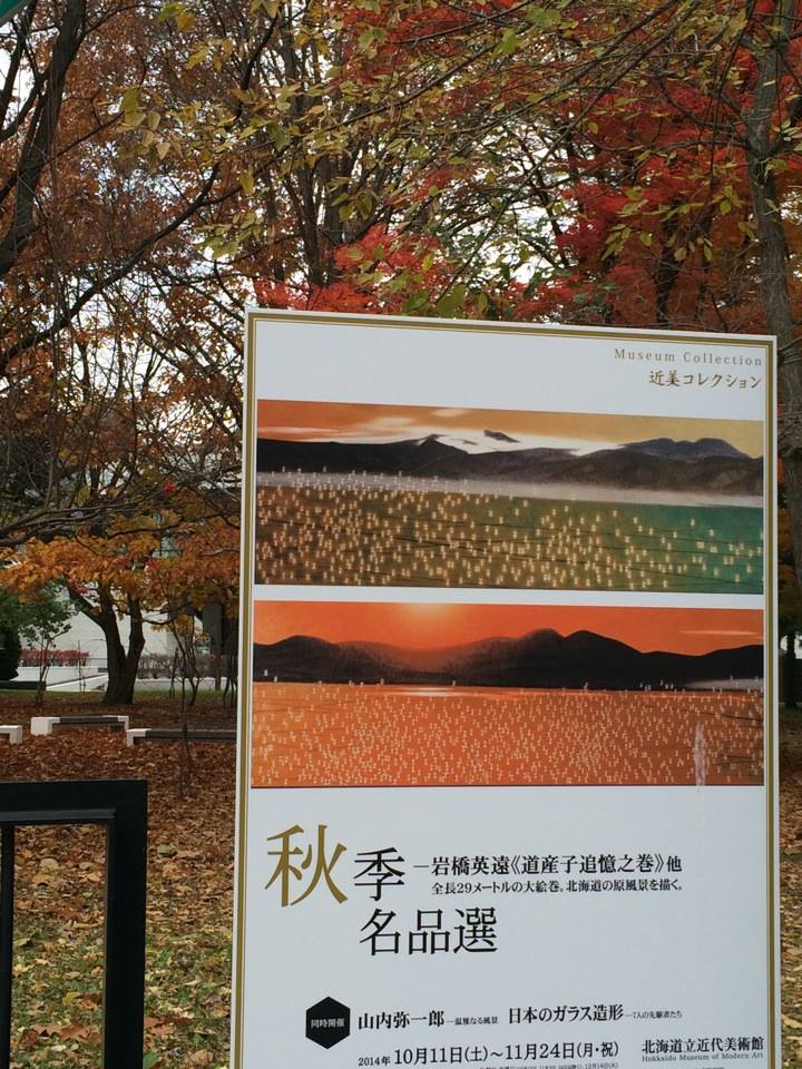 街の中心からちょっと離れたところにあるこの美術館、わざわざ訪れたのは、岩橋英遠の「道産子追憶之巻」が展示されているから。Webの写真で部分的に見たことがあったのだが、やはり本物が見たかった。この絵、全長29メートル。高さは無いが、巻物みたいに長いのである。画家の故郷の北海道の景色が描かれているのだが、本当に美しい絵だ。長い絵は、右から夜、早朝、朝、昼、夕方、そしてまた夜と一日が描かれている。その一日の中に四季を投影していて、夜から早朝は冬、朝は春、昼は夏、夕方は秋、そしてまた長い冬の夜に戻る。北海道の大自然の中に動物がたくさん描かれている。特に夏から秋にかけて、トンボの数が徐々に増え、秋の夕暮れの中でおびただしい群れになるその美しさは、筆舌に尽くしがたい。写真と実物の絵では全く違う。動物だけでなく、大自然の美しさと厳しさの中に人間の営みも小さく描かれている。こんなに見応えのある絵は、久しぶりだ。 他に片岡球子の「伊豆風景」も素晴らしかった。これも本物の持つパワーと色彩、大胆な構成に圧倒された。富士山にイルカというのもなんか斬新。四季をいっぺんに一つの絵の中に描いていて、これもまた斬新だった。 久しぶりにすごい絵を観られたなあ。おまけに無料だったのに、平日で館内ガラガラだったし。ゆっくりじっくり鑑賞できた。大満足。 北海道立近代美術館 秋季名品選 11月24日(月)まで |