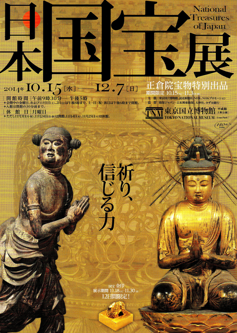 僕は、普段から東京国立博物館の常設展示に来ており、また京都や奈良のお寺や博物館、特別公開などに足しげく通っていたので、展示物のほとんどが過去に観たことあるものばかりだった。特に東京の国立博物館の所蔵品は、普段も時折さりげなく展示されていて、特別展でなければゆったり観られる。まあ、展示品全てが国宝だから、一堂に会して観られるという機会は貴重ではあるけれど、この大混雑では見たというだけで、鑑賞というのにはほど遠いな。 それでも、今回見とれてしまったのは、藤原為家筆の「土佐日記」写本。紀貫之のオリジナルは現存しないため、こちらが「土佐日記」で一番古いものになる。仮名文字をこんなにも美しいと思ったのは初めてだ。まるで文字が生きているかのよう、そして常に一番美しい形で留まっている。されど、次の文字へと流れて行く。為家の手を見ていると、彼と時を超えて通信できているような不思議な感覚に陥った。一ページしか展示されいなかったのが残念だった。全ページ見たかったなあ。 善財童子立像・仏陀波利立像は、当時の色彩が残っている部分もあり、当時の衣装のデザインを知ることができ興味深い。像を横からも見られるので、陽のあたりにくい部分には、くっきりと赤い色が残っていた。 「日本国宝展」平成館 特別展示室 2014年10月15日(水) ~2014年12月7日(日) |