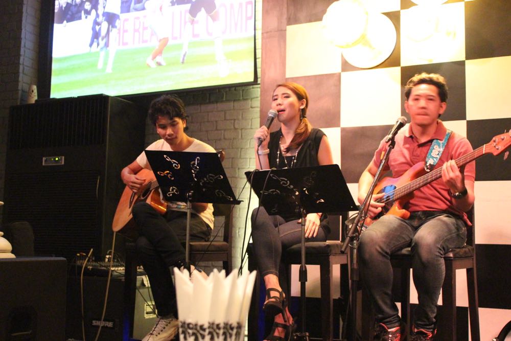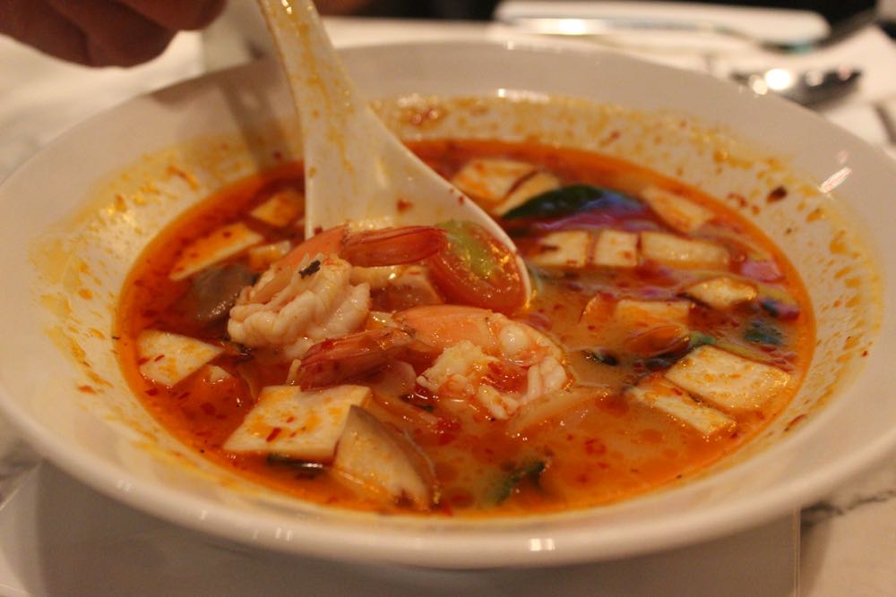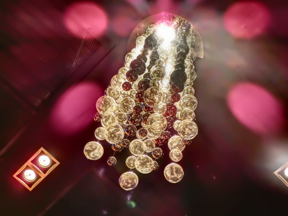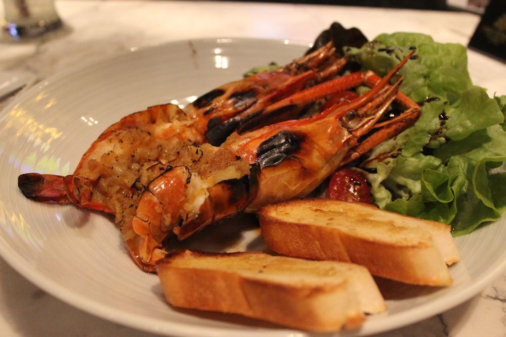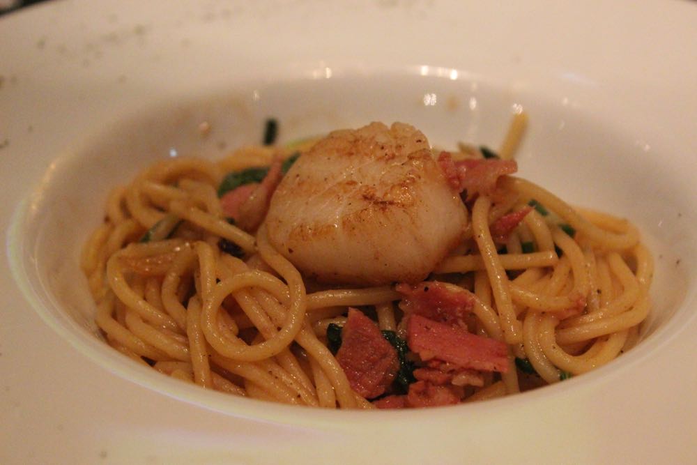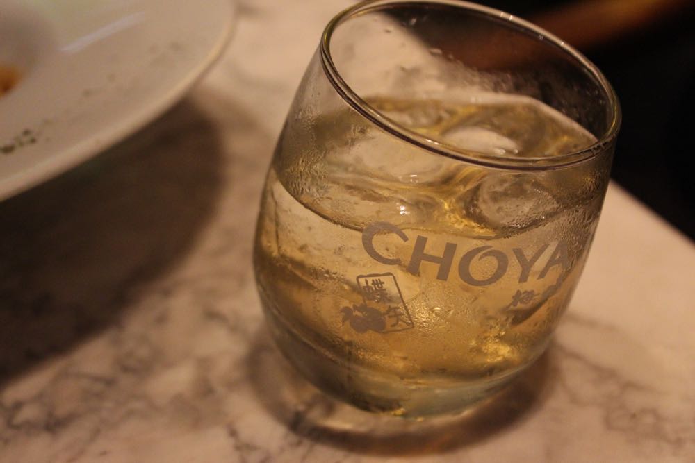 辛いものは苦手、でもやっぱりタイだからそれっぽいものを食べたい。そんなジレンマにAsiatique内をふらふらしながら、小洒落たお店を見つけたので入ってみることに。 トムヤムクンを注文してみた。注文の際に「辛くしないことできますか?」と聞いたら、「できますよ」というので頼んだ。でも料理は赤くて辛そう、食べてみた、全然辛くな〜い。美味し〜い。トムヤムクンを食べられたから、タイに来た感も出ているし、やったね。 ホタテとベーコンのパスタ。これもメニューには、チリ入りと書いてあったけど、「唐辛子抜いて」とお願い。これも美味しい。いやあ、辛くないの幸せ。 天井のシャンデリアも洒落ていた。 店内には生バンドも演奏とサッカー中継。(笑) バンド・メンバーが若い。地元の若手ミュージシャンという風情。全曲洋楽カバーだった。タイの今流行の音楽とか聴きたかったな。 チョーヤの梅酒。底が尖っているグラスなのでテーブルの上でコロコロ揺れる。 お店の人におすすめを聞いたら、絶対これと言われ注文。ガーリックたっぷりの海老。ものすごく美味しかった。