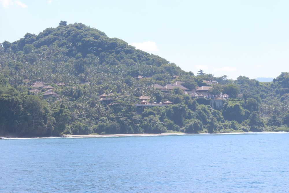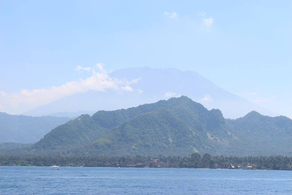 途中、シュノーケリングもできる。バリ島にも浜の近くに珊瑚礁があったのだね。沖縄で見たことがあるような熱帯魚がたくさん泳いでいた。パンをもらったので魚にあげようとするとものすごい勢いで魚が手にアタックしてくる。 水中でも撮影できるカメラがあると良かったなあ。あんなにたくさん魚がいるとは思わなかった。 シュノーケリングは楽しかったけど、背中が火傷したように日焼けしてヒリヒリ。 船の上でランチ。 船からアマンキラの全貌が見えた。 ちょっと霞がかってはいたけど、聖なるアグン山も見えたよ。 これは、神々しい迫力。 |