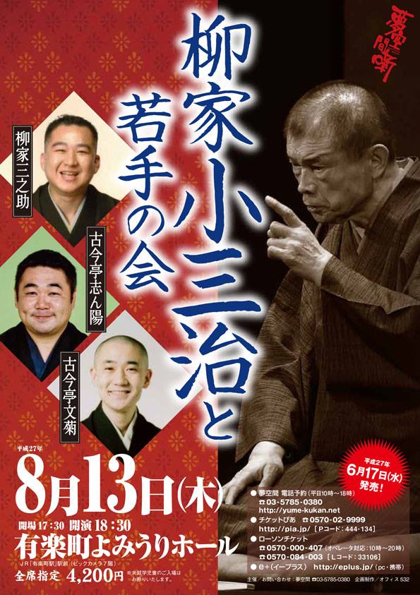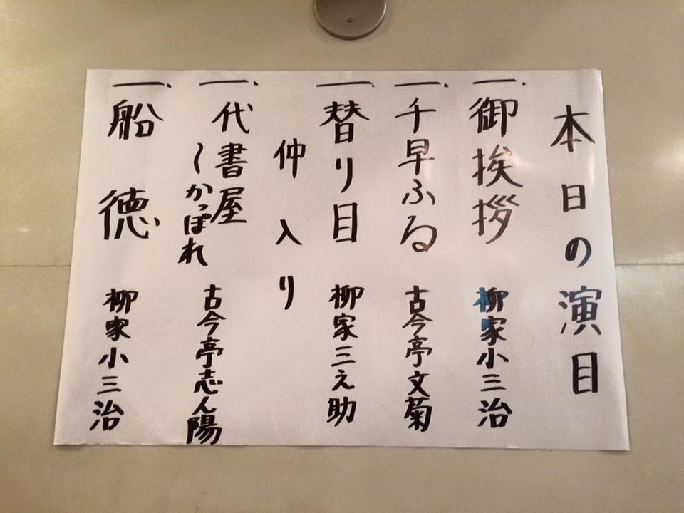 今回は、8月13日だし、お盆期間だから休めるかなと数ヶ月前からチケットを購入。早々と休みを入れていた。しかし、突然大きなプロジェクトの責任者になってしまい、出社して会議と仕事をこなし、午後半休のよう夕方早退のような形で会社をなんとか出る。 有楽町よみうりホールの立地は最高だ。会社からも自宅からも近いので、行くのも帰るのも楽チンだ。 小三治 開口一番 舞台には、開口一番のめくり。今日の前座さんは誰だろうと思っていたら、小三治師匠が出てきて会場大盛り上がり。立ったまま、今回の会の経緯を説明。嬉しいサプライズだった。 文菊 「千早ふる」 小三治師匠とのエピソードをまくらで。 相変わらずの飄々とした風情で先鋒を務める。 三之助 「替り目」 一番安心して聴ける三ちゃん。酔っ払いも女房も本当に素敵な人物描写。時間の関係か、ちょっと早口でサゲまで行けなかったのがちょっぴり残念。 志ん陽 「代書屋」 / 踊り「かっぽれ」 縦横無尽で堂々としている。先日の王子の会でもそうだったが、メキメキと力が付いてきていて、毎回驚かされる。楽しい高座だった。住吉踊りの最中で踊りも披露。 小三治 「船徳」 やはり季節のネタが演じられるといいよねえ。それも小三治師匠だよ。サゲまで行かなかったけど、久しぶりに小三治師匠の高座が堪能できて大満足。何度も聴いている噺なのに、何かが違う。そこにあるはずのない江戸の町が浮かび、大川が流れ、登場人物が生き生きと目の前に現れてくる。やはり、すごいなあ。 今日の若手も皆、それぞれ将来が本当に楽しみだよねえ。 有楽町のビッグカメラ前からバスに乗って、あっという間に帰宅。便利だなあ、ここは。 |