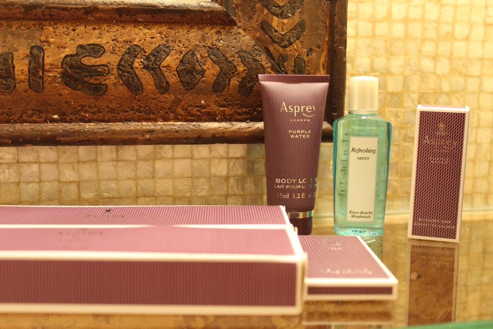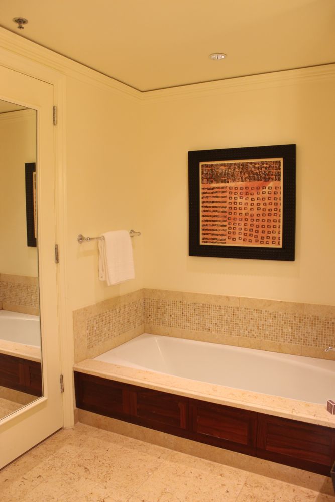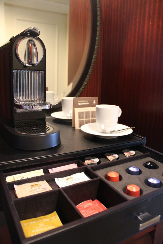 バスルームのタブは低め。シャワーブースが別にある。 アメニティは、Asprey。 部屋には、Nespressoが置いてあり、カプセルはなくなると補充してくれる。 部屋の冷蔵庫は、からっぽ。ホテル内の売店またはリゾート内のショップで飲み物を買うことができる。