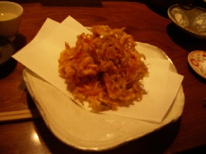 桜海老の天ぷらを塩で。塩がさらさらだった。沖縄の雪塩みたいだった。