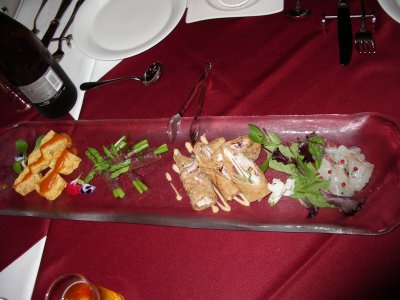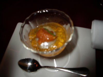 自分の関わったビッグ・プロジェクトが成功裡に終わったので、今日はその打ち上げに。店内がちょっと暗めだったのでピントがあわずボケた写真になってしまった。 これは、オードブル。人参のムース コンソメのジュレに雲丹をのせて。 大人数で行ったので一人一人サーヴされないのが玉に瑕だが、まあしょうがないか。 前菜たち。 こだわり卵とエストラゴンのオムレツ 赤ピーマンのソース アスパラガスをなんかの肉で巻いたもの 地鶏ささ身のグリエを全粒粉のクレープで巻いて 鯛のカルパッチョ 本日のポタージュ。 ズッキーニだった。 パスタ ハマグリと季節野菜のバベッティーニ イタリア産トマトとルッコラをのせて 特選牛肉とエリンギ茸のオーソブッコ風煮込み ポレンタのグリエとレモンオイルのアロマ デザートは、写真撮るの忘れて食べちゃった。ベリーフルーツのパンナコッタだった。 苦労をともにした仲間との会食、楽しい一時を過ごせた。 |