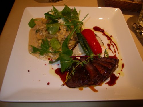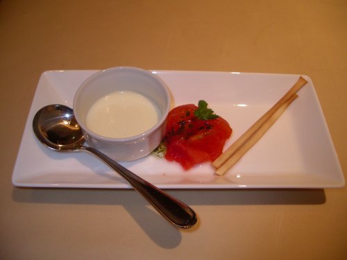 会社の同僚の異動があったので、チームの皆でランチへ。六本木一丁目の駅の上、泉ガーデンにあるスペイン料理「TESORO」へ。フレンチテイストのスペイン料理とのことだが、どちらかというとイタリアンに近い感じがした。 トマトを使った前菜。酸味の少ない甘いトマト。あっさりした味で美味しい。 ポルチーノ茸のクリームパスタと牛の股肉。濃厚なクリームのパスタ、ポルチーノ茸は、やっぱり美味しい。我ながらナイスなチョイス。肉はちょっと固かったけど、オリーブ・オイルのソースは美味だった。 でも、女性だけデザートが付くという差別的な店だ。 |