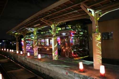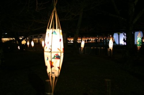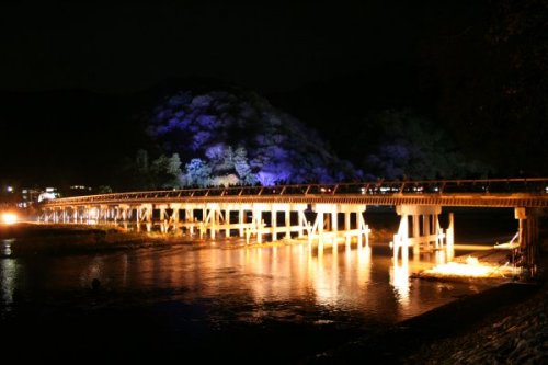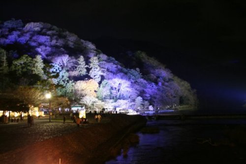 後ろのライトアップされた山は、もう紅葉が終わっていて裸の枝が多いのだけど、それが逆に冷たく幻想的で良い効果だった。