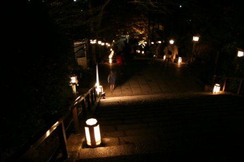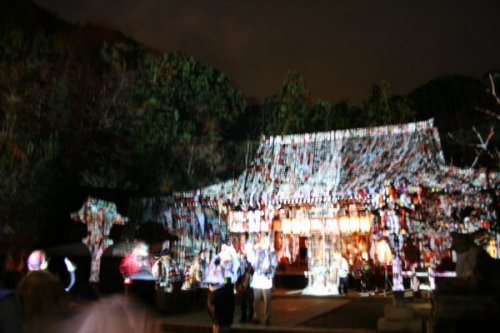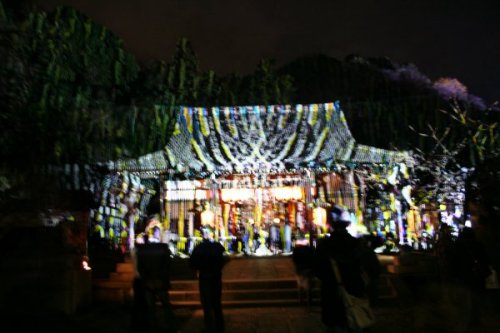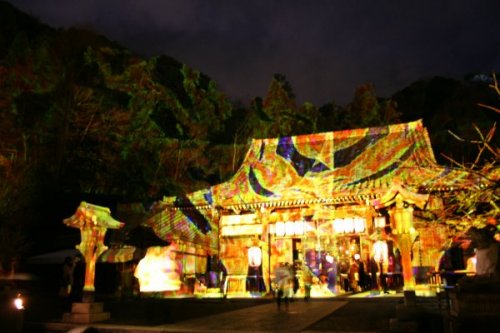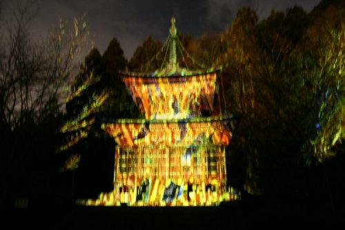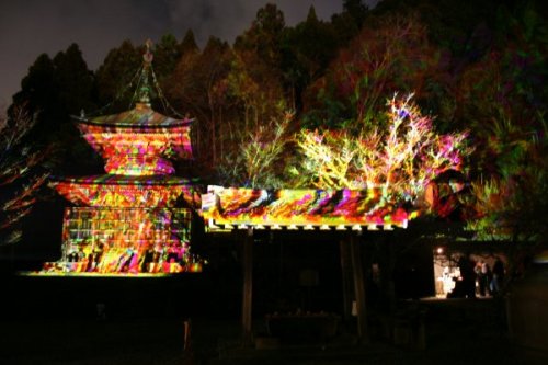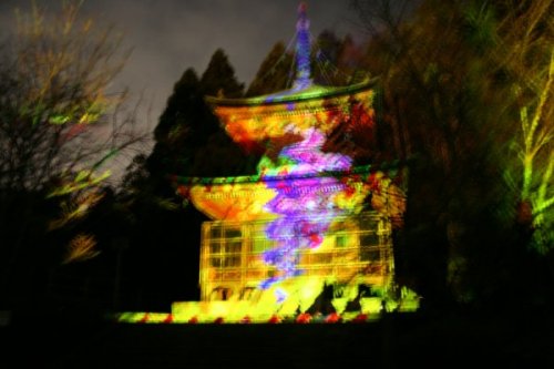 法輪寺では、お寺の本堂と多宝塔にプロジェクターで映像を映していた。100万通りの映像を出せるそうで、見る見るうちに次々と違う色彩が現れてくる。よく見ると、後ろの山肌にも映像を投影しており、まさに夜の自然のキャンバス。