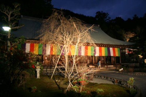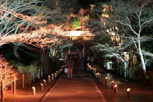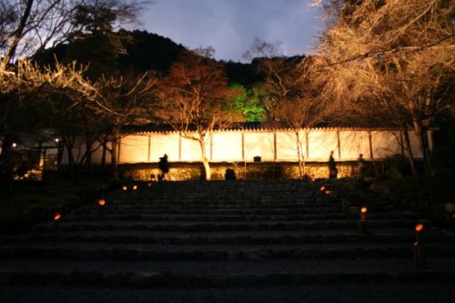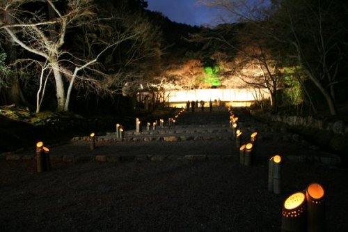 嵐山花灯路という夜のイベントが明日まで開催中。灯籠やライトアップが嵐山の各所で実施されているが、どこもすごい人だ。 同時に開催されている寺社の夜間開放。こちらは、別途拝観料が必要なためか、かなり空いていた。普段は、入ることができない夜の境内。竹を斜めに切った筒の中に蝋燭を灯し、なんとも幻想的だ。 二尊院は、小倉百人一首で有名な藤原定家の時雨亭があった場所。山門続く長いアプローチの参道は、昼でも美しいが、夜はより一層幻想的な風情を醸し出していた。 境内でモンゴル楽器のコンサートなどが開かれており、その不思議な調べは、どこか懐かしく心に響いた。 本当は、もっと暗い中で灯りが揺らいでいるのだけど、写真だといらぬ光まで集めてしまい、うまく表現できないなあ。実際は、もっと雰囲気がいいんだよ。 クリスマスのイルミネーションみたいだけど、本当はもっと暗くてちょっと不気味なの。夜の闇は怖いものというのが納得できる感じ。人はたくさんいるけど、ちょっと参道から外れると怖いよー。 |