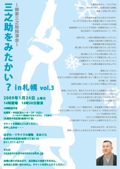 札幌市中央区民センターで開かれた三之助の独演会へ。 先日、オーストラリアへ帰る上司に「明日は、会社を休んで札幌に行くから、今日お別れを言っておくね」と言ったら、「札幌に何しにいくの?」と言われ、「落語を観に行く」と答えたら、「落語とは、東京では観られないものなのか?」と聞かれた。(笑) 三之助 「時そば」