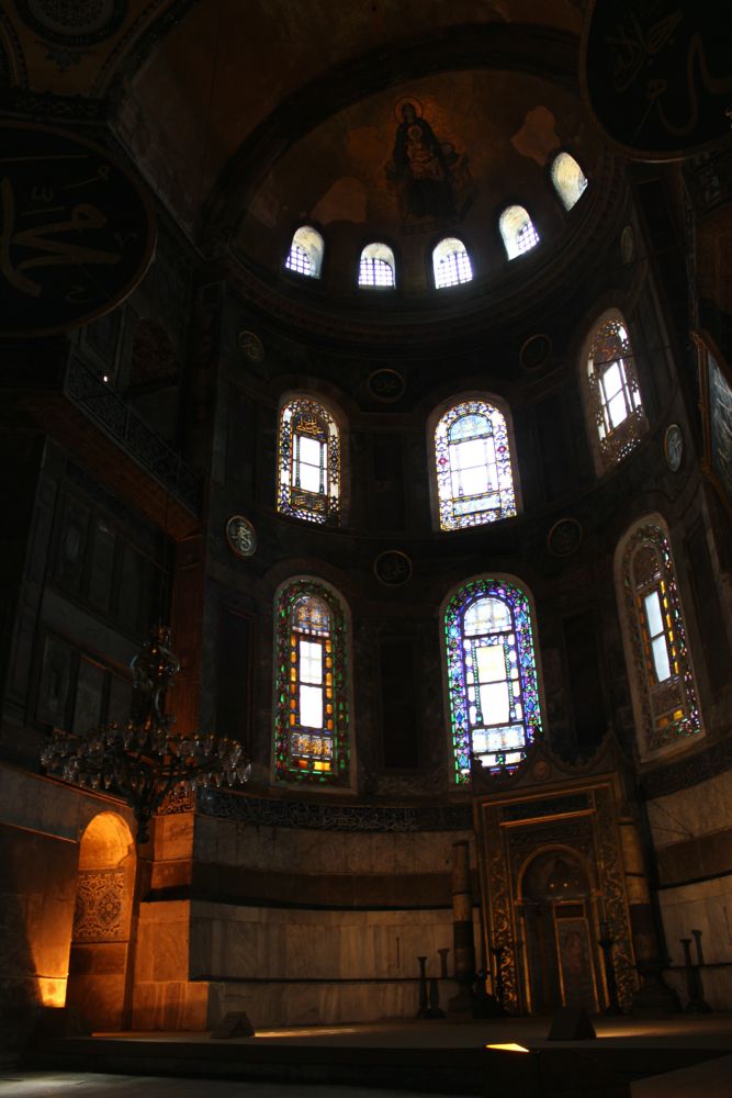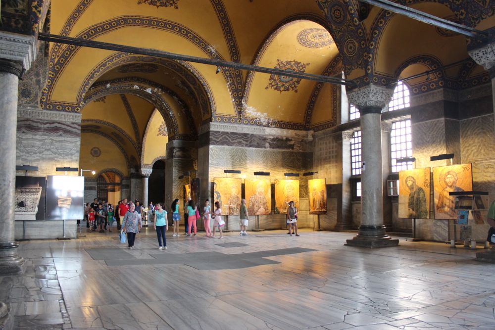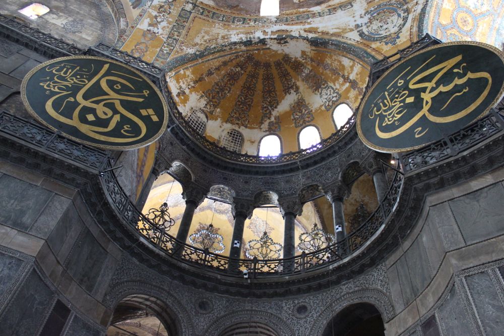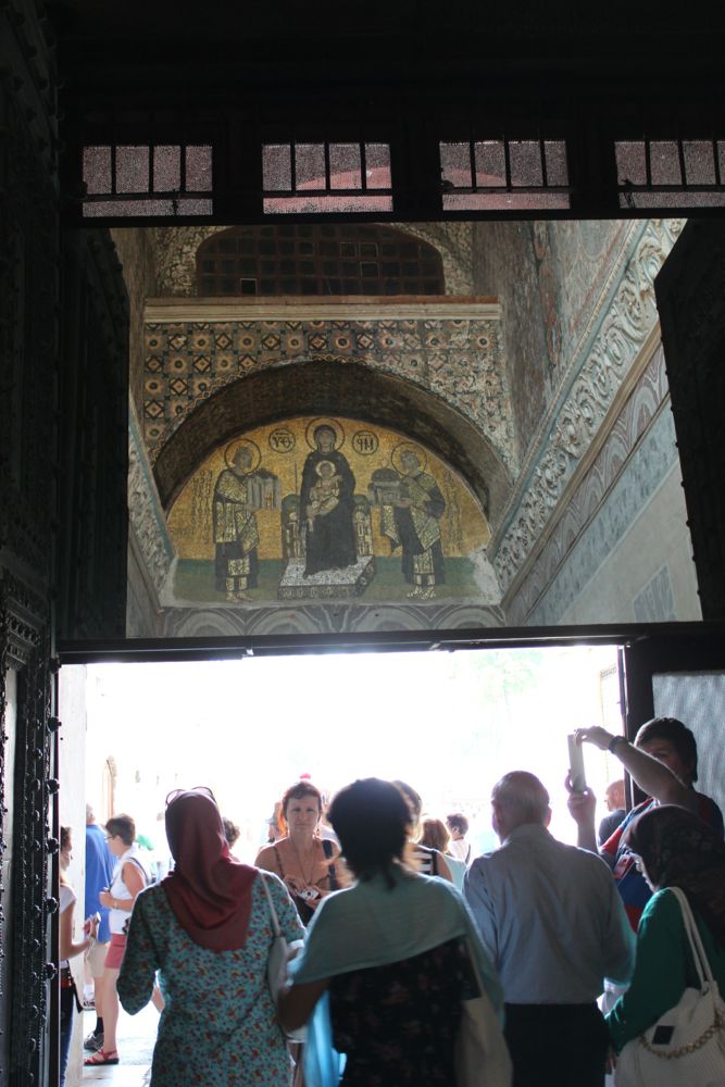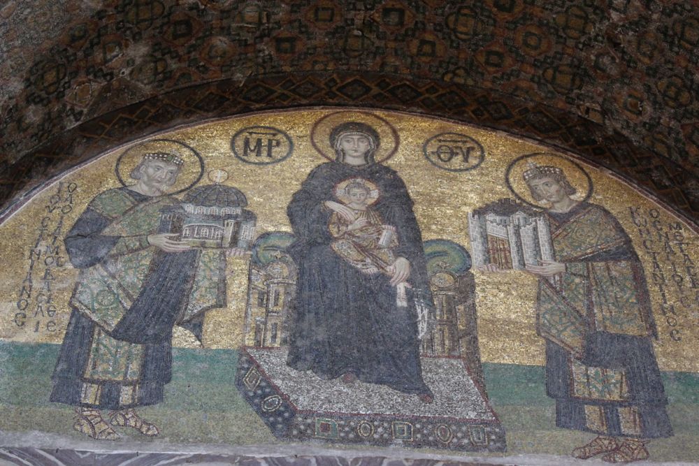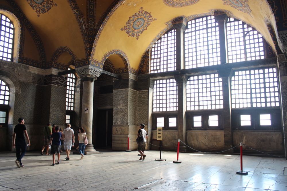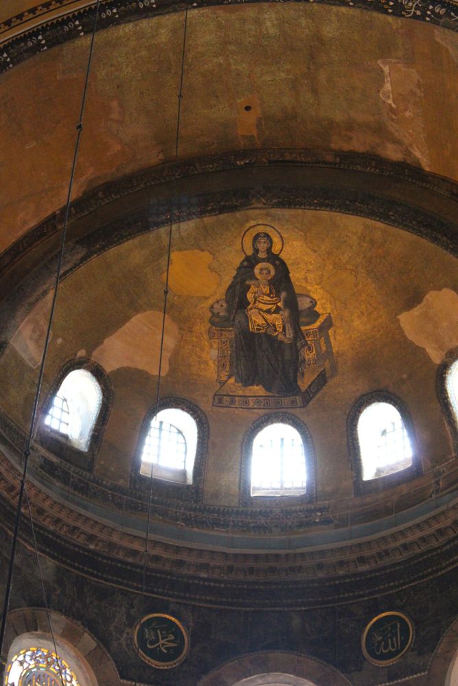 アヤソフィア、ギリシャ語でハギアソフィア。その歴史は、360年まで遡れる。当時は、まだ東ローマ帝国の首都コンスタンティノープルだった。コンスタンティノープル、ああなんという響き。歴史好きにたまらないね。 火災による焼失、反乱による倒壊を経て、現在の建物は537年のものだ。1400年以上経っているんだねえ。ブルーモスクと呼ばれるスルタンアフメト・モスクの青に対して、こちらは朱色がかっている。もともとはキリスト教寺院として建てられたが、1543年にオスマントルコの時代に壊されずにイスラム教寺院に改修された。その際に建てられたのが尖塔であるミナレット。不思議と、最初から設計されていたかのように違和感がない。まあ、現代人はこの姿しか見たことがないわけだが。 現在は、博物館になっている。こちらも大行列。すると日本語ペラペラのトルコ人がやってくる。今は大行列で午後には空くからそれまでうちの店で涼もうと言う。親日的トルコだから、あまり邪険にしたくないけれど、絨毯屋だった。日本で買うと90万円の絨毯が、今ここで買うと20万円。せっかくトルコに来たのだからと、記念に何か買って行くべきと、ものすごくしつこい。iPhoneで日本に行った時の写真を見せる。そこには、日本の家族と写ったもの、日本の有名人と写った写真がたくさん。それを見せれば信用すると思ったのかな。本当に親切で90万円の絨毯を20万円で買えることを知らせたかったのかもしれない。でもねえ、観光旅行で来ているんであって、いきなり何十万円もする絨毯なんていらないよねえ。そんなお金持っていないと言っても、クレジットカードも使えるから大丈夫とか、ものすごく商売熱心。買う人がいるから熱心なんだろうねえ。観光で何十万もする絨毯はいらないよねえ。 で、アヤソフィアの行列に並ぶ。ふと横の看板を目にすると「Avoide the queue, use KIOSK」とある。列の側に入場券の自動販売機があった。そこには、2、3人しか並んでいない。対面販売の窓口は、何百人って並んでいる。とっても不思議だったけど、自動販売機に行ってチケットを買う。なんと、自販機の前にも係員が居て操作の説明をしてくれた。 クレジットカードも使えて便利。あっと言う間にチケットが購入でき、大行列の人たちを不思議そうに眺めながら館内へ。 内部は修復中だったけど、何百年と時を経ても色あせない意匠の素晴らしさに圧倒された。 いろんな色の石、マーブルな石と円形を配したデザインも秀逸。 塗られた漆喰の下から出てきたキリスト教の絵画。 ステンドグラスも美しい。 いかにも中世っぽい回廊。この右横にある入り口に階段があり2階に上がることができる。 2階も天井が高くそして広い。ここは博物館らしい展示がある。 キリスト教的世界とイスラム教的世界が共存している、とても不思議な空間だ。 2階からの眺め。人々が小さく見える。かなり高いんだね。 出口付近にあるモザイク画。出口の背面にあるため、気づかずに出て行ってしまう人が多いため、出口上に鏡が取り付けられており、それを見て後ろを振り返れるようになっている。 |