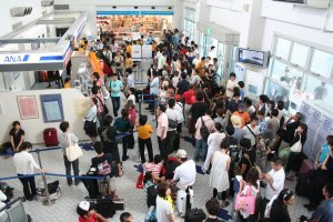 台風で二日半飛行機が飛ばず、キャンセル待ちの大混雑の中、なんとANAのコンピューター・トラブル。空港に着くと、ロビーに入りきれない人が空港前の駐車場にも溢れていた。荷物を預けることもできず、人と大きなスーツケースで空港ロビーは大混雑だ。