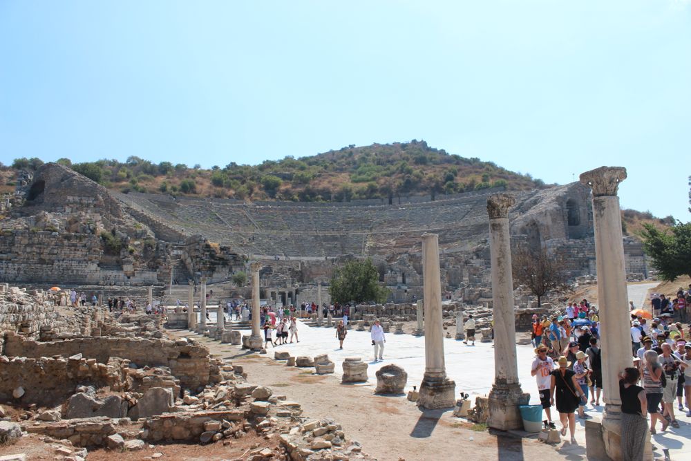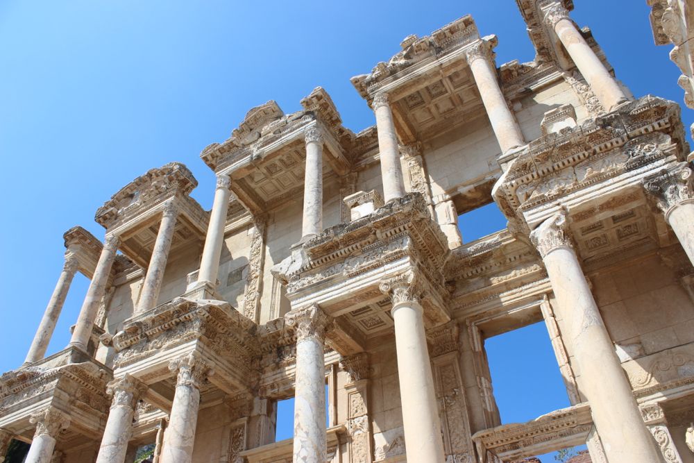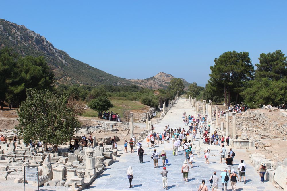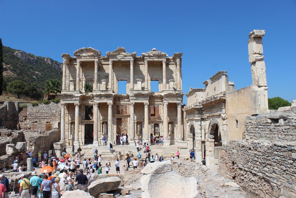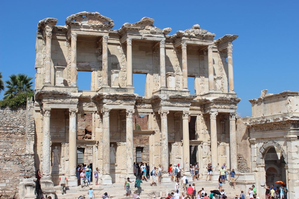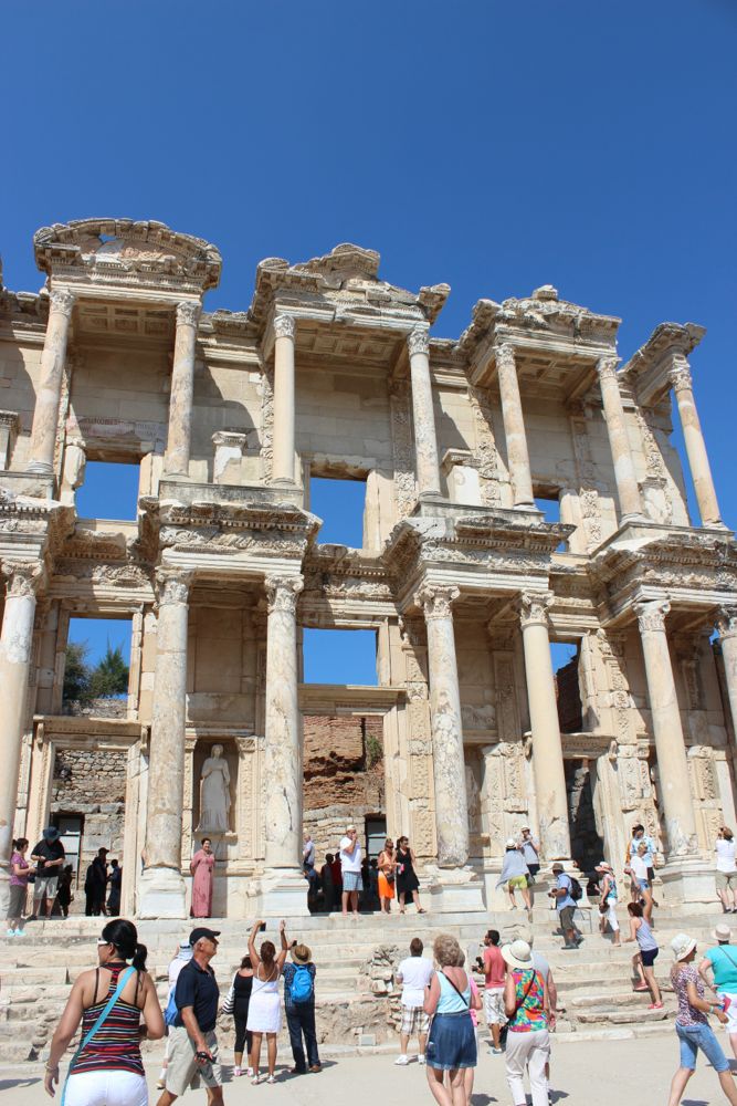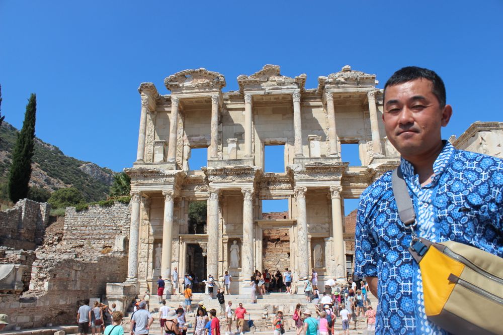 遺跡好きの僕としては、ここエフェソスは随分昔から憧れていた場所だ。世界遺産は、意味付けに重きが置かれているので、例えばチュニジアのカルタゴは、その歴史的重要性の意味はあるけれど、遺跡としてはほとんど残っていないに等しい。だから、ギリシャでも同じく世界遺産だったオリンピアには行かなかった。それに比べるとエフェソスは、街の形として遺跡が残っているので心躍る。 それにしてもすごい人の数。ここが放棄された古代の遺跡とは思えぬほど。 歴史は、紀元前1000年まで遡ることができる古い街。往事は、港湾都市だったが、街が放棄され土砂がたまり、今は海からは遠い。 これがとても保存状態がいい図書館の遺構。当時、アレキサンドリア、ペルガモンと並び、世界三大図書館の一つだった。 本体は焼失してしまったのだが、柱やレリーフ、像、門構えの外観はとてもよく残っていて、当時の建築の様式を知ることができる。随分大きな図書館だったのだと古の知識人たちに思いを馳せる。 優れた音響効果を誇った大劇場も綺麗に残っている。観光客が皆、舞台の中央で手を叩いてその反響を実感していて。2万5000人を収容できたそうだ。大都市だったことが伺える。 かつてこの道の先に港があり、海が広がっていた。 港へ続く道から劇場を振り返る。本当に大劇場だ。 |