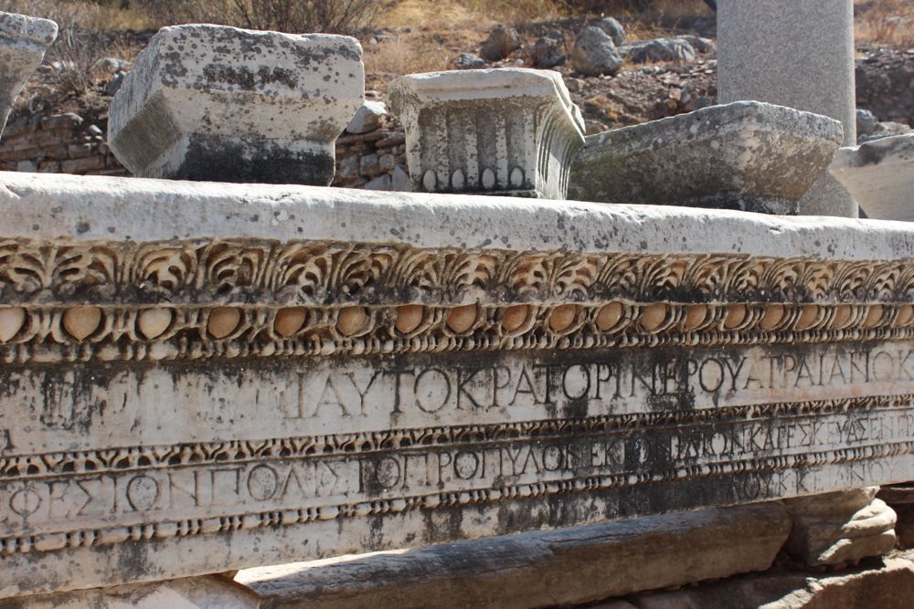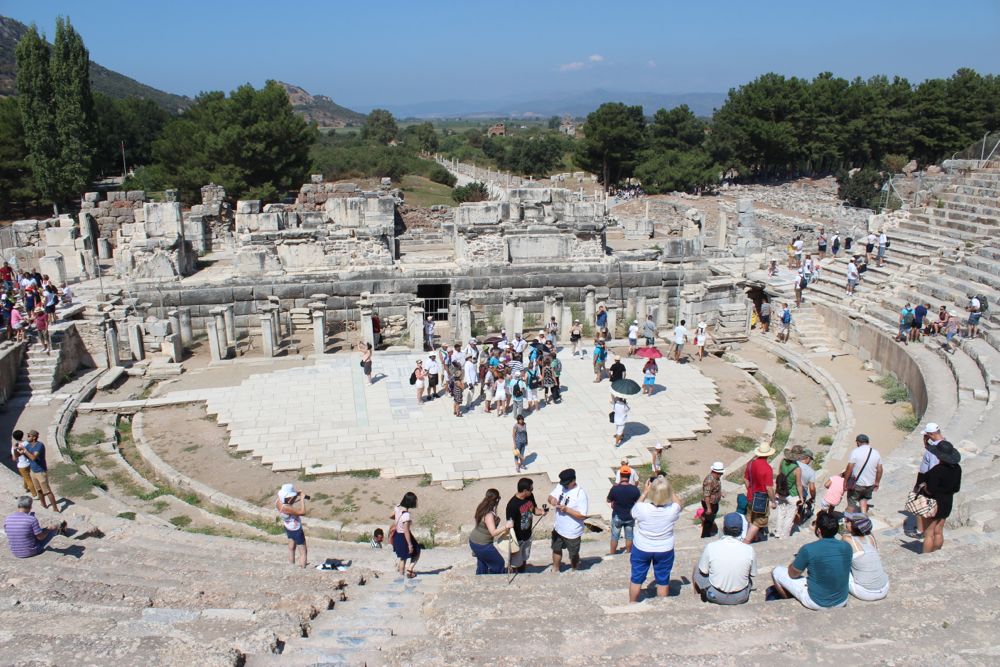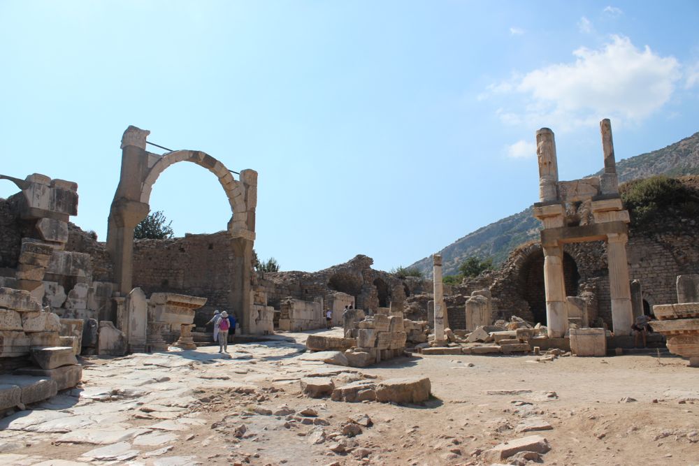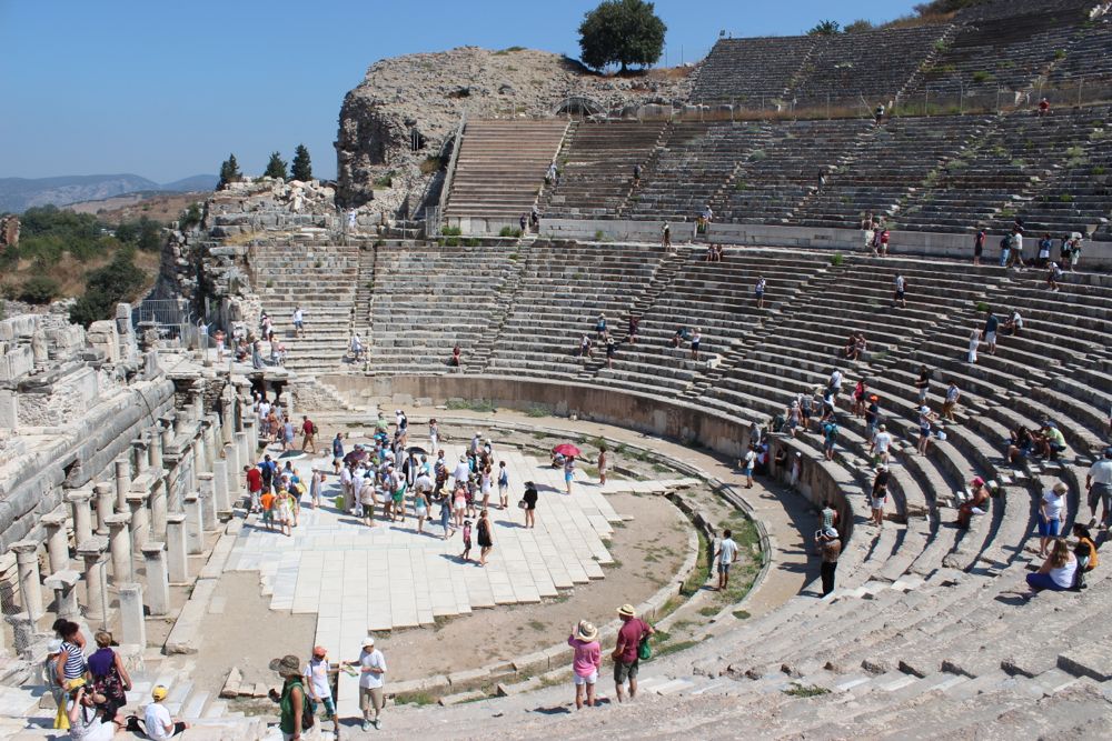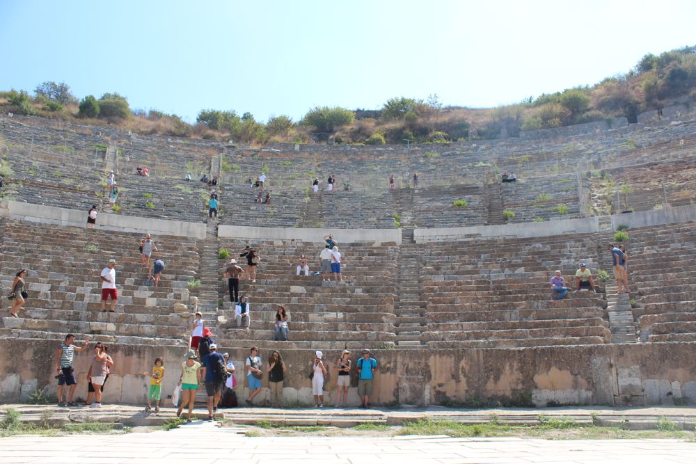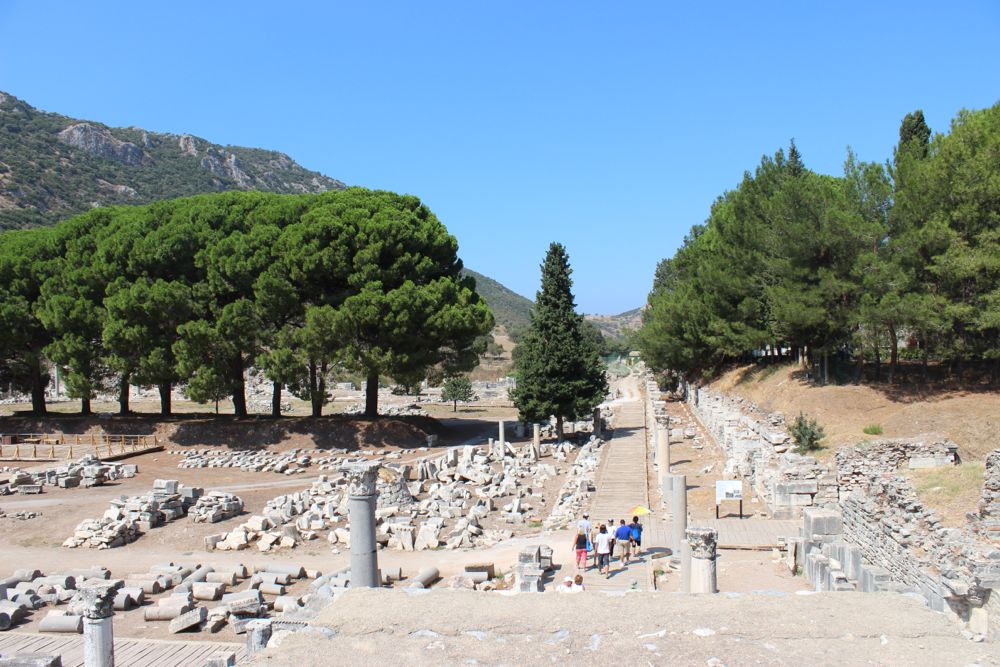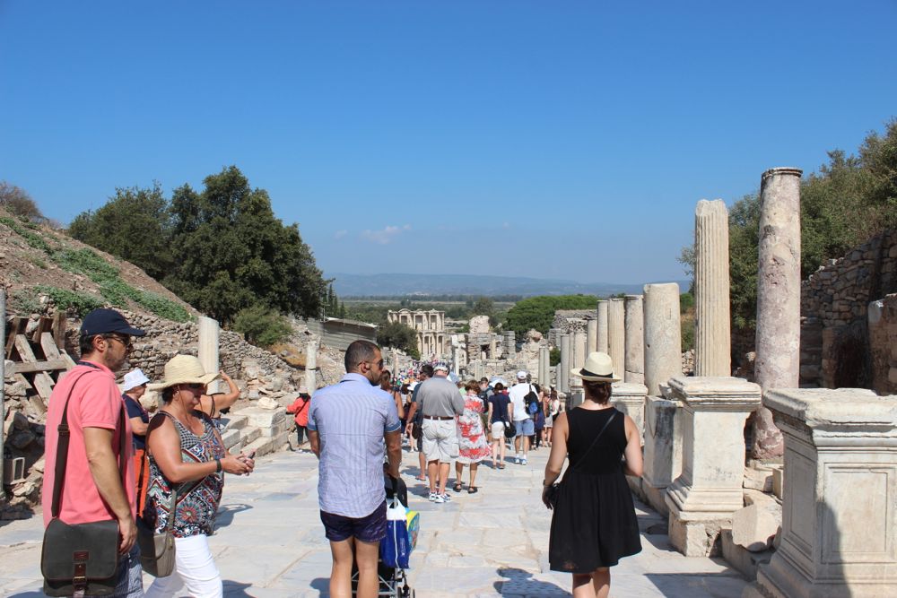 遺跡好きの僕としては、ここエフェソスは随分昔から憧れていた場所だ。世界遺産は、意味付けに重きが置かれているので、例えばチュニジアのカルタゴは、その歴史的重要性の意味はあるけれど、遺跡としてはほとんど残っていないに等しい。だから、ギリシャでも同じく世界遺産だったオリンピアには行かなかった。それに比べるとエフェソスは、街の形として遺跡が残っているので心躍る。 それにしてもすごい人の数。ここが放棄された古代の遺跡とは思えぬほど。 歴史は、紀元前1000年まで遡ることができる古い街。往事は、港湾都市だったが、街が放棄され土砂がたまり、今は海からは遠い。 これがとても保存状態がいい図書館の遺構。当時、アレキサンドリア、ペルガモンと並び、世界三大図書館の一つだった。 本体は焼失してしまったのだが、柱やレリーフ、像、門構えの外観はとてもよく残っていて、当時の建築の様式を知ることができる。随分大きな図書館だったのだと古の知識人たちに思いを馳せる。 優れた音響効果を誇った大劇場も綺麗に残っている。観光客が皆、舞台の中央で手を叩いてその反響を実感していて。2万5000人を収容できたそうだ。大都市だったことが伺える。 かつてこの道の先に港があり、海が広がっていた。 港へ続く道から劇場を振り返る。本当に大劇場だ。 |