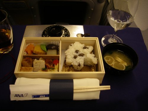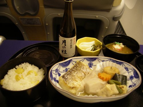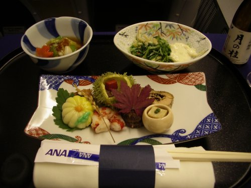 機内食は、和食を選択。僕の場合、だいたい日本発の便は和食、外国発の便は洋食にしている。 和食の場合は、やっぱり日本酒やね。 前菜 ・海老 ・子持ち鮎煮浸し ・鱧山椒焼き ・ウニ豆豆腐味噌漬け ・菊花麩 ・渋皮いが栗 小鉢 ・鰻かぶら無視 べっこうの餡掛け ・水菜のお浸し ・とろ湯葉 美味出汁風味 いやあ、機内食でこれだけ目にも舌にも訴えられるのだから、すごいよなあ。 主菜 ・甘鯛若狭焼き ・飛竜頭 ・海老芋 栗銀杏ご飯 味噌汁と香の物 甘鯛が旨いよー。たまらんねえ。 デザート 4種類から選べる。 温製マロンコンフィのドーム仕立て キャラメルアイスクリーム添え まあ、これが絶品。マロンのコンフィが信じられないくらい旨い。これが機内食なの?すごいよ全日空。 あと機内食のアイスって固くて美味しくないんだけど、このキャラメルアイスクリームは、甘さ、濃く、苦みどれも最高。すげえ旨え。 とりあえず、5時間待った疲れを食べて癒す。 なんか飲み疲れたので、到着前の軽食の時は、水とウーロン茶に。 やっぱり和食にした。包みも秋らしい。 ・銀鱈西京焼き 吹き寄せ盛り ・野菜の炊き合わせ ・季節の彩りご飯 ・味噌汁 |