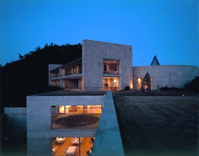 直島にある護王神社。江戸時代から祀られている護王神社の改築にあわせ、本殿と拝殿の建物、また拝殿の地下の石室を杉本博司が設計したもの。この神社の模型が、昨年、六本木ヒルズで開催された杉本博司展にあり、それを見た時から、ここを訪れたいと思っていた。 小高い丘の上にあり、海を眺めることができる。まるで、沖縄の御獄(うだき)のような神聖な印象を受けた。 六本木ヒルズの模型は、階段を上ることができたが、もちろん本物はできな。白い玉砂利の空間は聖域だから、普通の人は、入ることができない。 階段が秀逸で、氷のような段になっている。これは、硝子なのかアクリルなのか素材は、分らないけれど、このミスマッチな感覚が何故か違和感がないのだ。そして、この階段、地下の石室へと繋がっている。それも含めて杉本の設計だ。 神社の本殿と拝殿の全景。 |