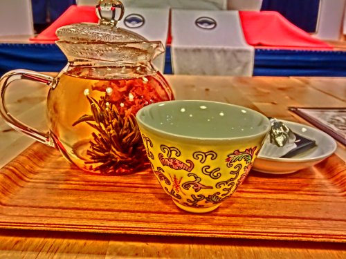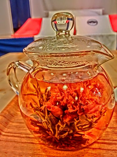 何故かあまり宣伝されないこの落語会。お客さん6人なんて時もあったけど、このところジワジワとお客さんが増えてきて、今日は今までで一番賑やかだったよ。 会の名前の通り、テーブルがあってメニューも置いてある。開演前と仲入りは、ぼたんさんが注文とってくれて配膳してくれる。このスタイルをとりたいがために、あえてあんまり宣伝してないのかなあ。 らくごカフェの中国茶セット。急須と茶碗が素敵だわん。この会の時は、お茶菓子がサービスで付くのよ。最初の頃は、ぼたんさんの手作り菓子だったのにな。 急須の中で花が咲く。丸みを帯びた透明な急須の中で広がる感じが素敵。 蓋の取っ手が水晶玉みたいで、高座がひっくり返って映ってる。 この間は、気付かなかったけど、上を向いたら天井は、噺家さんの手ぬぐいギャラリーになってた。 朝太・喬之進・ぼたん オープニング・トーク