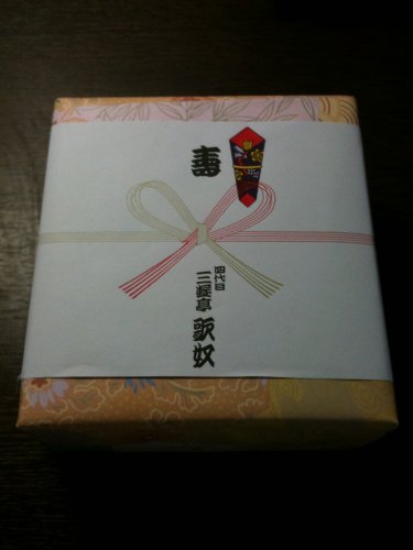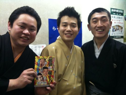 先日の櫻田落語会で、歌奴師匠が「今度初トリを取ります」ってことで、チケットを販売していた。その時にチケットを買ってくれた人に記念品をプレゼントし てくれていたんだけど、僕とにっしさんが買った時には、そのプレゼントが品切れになってしまい、今度寄席に来た時に「楽屋に寄ってね」ということだったの で、にっし君と出かけてきたよ。