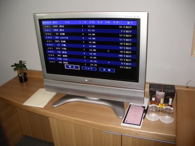 流石、空港のホテルです、部屋のテレビでフライト・スケジュールが確認できます。液晶テレビも大きいですね。スーペリアルームは、もう少し小さいようですが・・・。