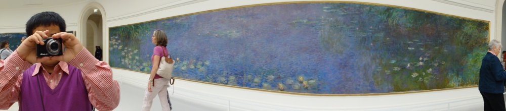 ここでスイングパノラマしたかったから、SONYのデジカメ買ったのよねえ。(パノラマはクリックで拡大) まさに作品と展示空間の関係がどれほど大切かを教えてくれる場所だ。 1階は、モネの睡蓮だけのための部屋。 手前の一室が明るい色調の睡蓮の部屋で、奥が濃い色調の睡蓮の部屋だ。同じ画家の同じモチーフの絵だが、それぞれの部屋の印象はまるで違う。 小さい美術館だけど、絵の世界に入りこんだような錯覚を覚える。パリに来たら、必ずおさえてほしい美術館だな。 地下が画商ポール・ギヨームが集めたコレクションの展示。ルノアール、ピカソ、ローランサン、モディリアニ、ユトリロなどパリで活躍した画家の作品が並ぶ。 パリの美術館でよく見かける風景。学校の美術の授業なのかな? また、この美術館の地下では、発掘された16世紀の城壁跡がそのまま展示されている。 |