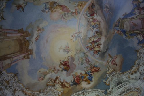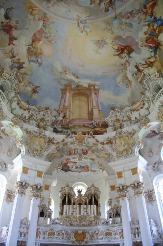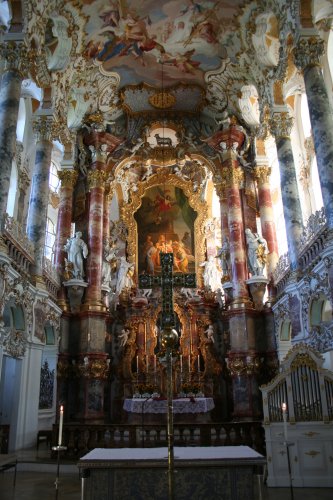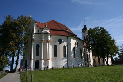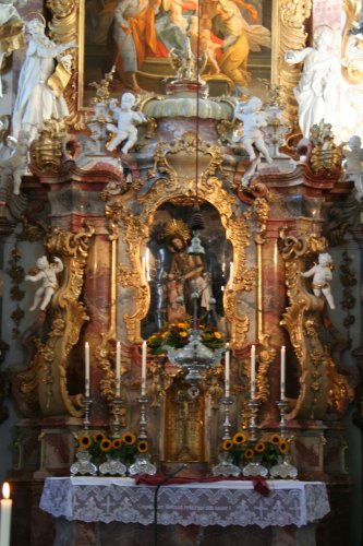 フュッセンからバスで40分ほど。のどかな牧草地に立つ外観からはなんの変哲も無い教会。でもここが世界遺産なのだ。 この教会の世界遺産たる所以は、内部にある。ヨーロッパ随一というロココ装飾が、まあ絢爛豪華に広がっているのだ。もともとは、農夫がもらい受けた木造の「鞭打たれるキリスト像」が涙を流し、それを一目見ようと次々に集まってくる巡礼者のために建てられた教会だそうだ。 確かに内部の装飾が美しい天井画は、すごいのだけど、正直「これが世界遺産?」という印象だった。これなら、平泉の中尊寺の金色堂の方がいいと思うけどなあ。まあ世界遺産は、建物の良し悪しよりその意味付けも重要視されるからなのだね。 これが鞭打たれる木造のキリスト像。 僕は、内部よりこの牧歌的な風情の中の佇まいが好きだよ。遠くに見える山々の稜線も美しかったしね。 |